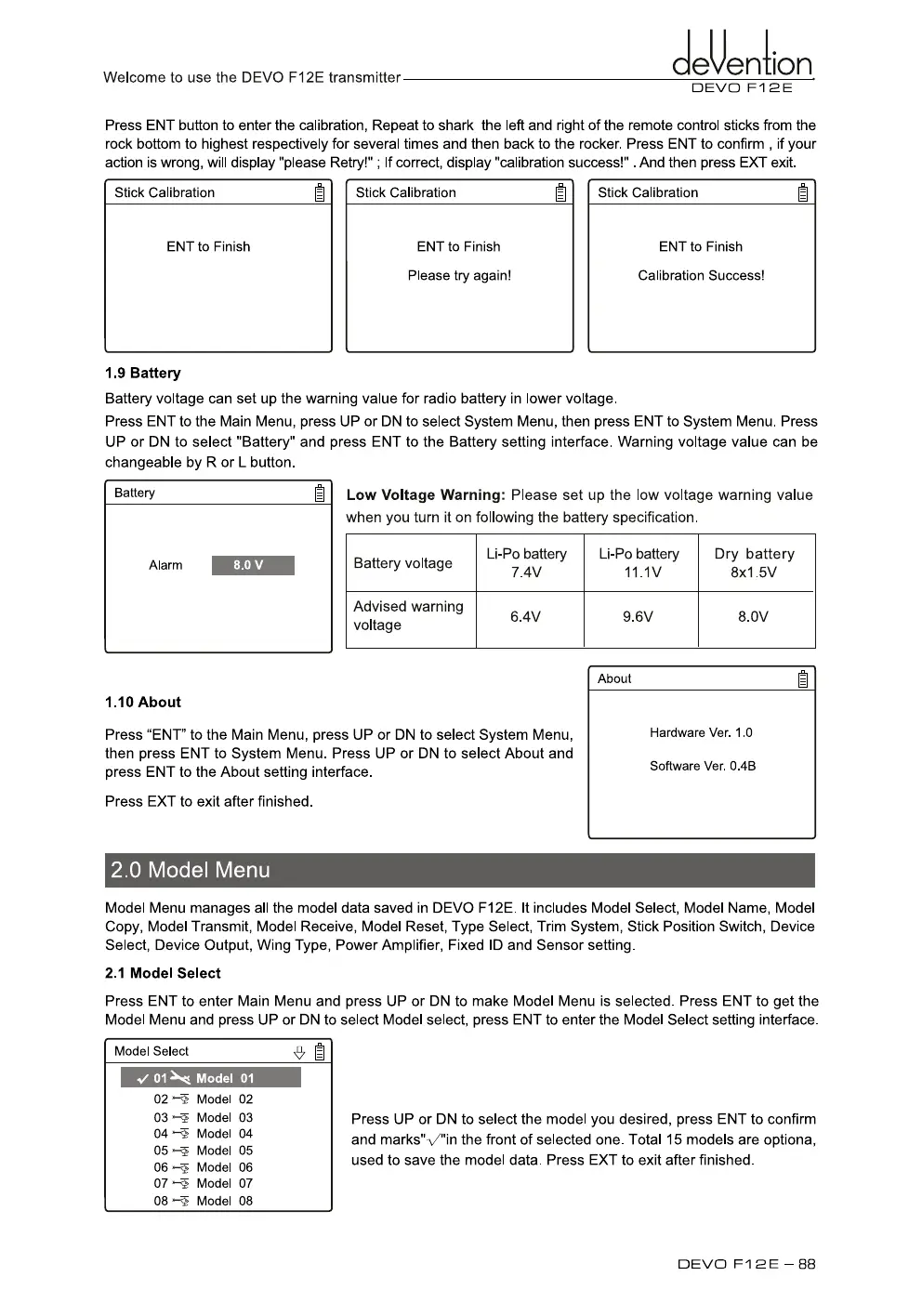 Model Menu manages all the model data saved in DEVO F12E. It includes Model Select, Model Name, Model