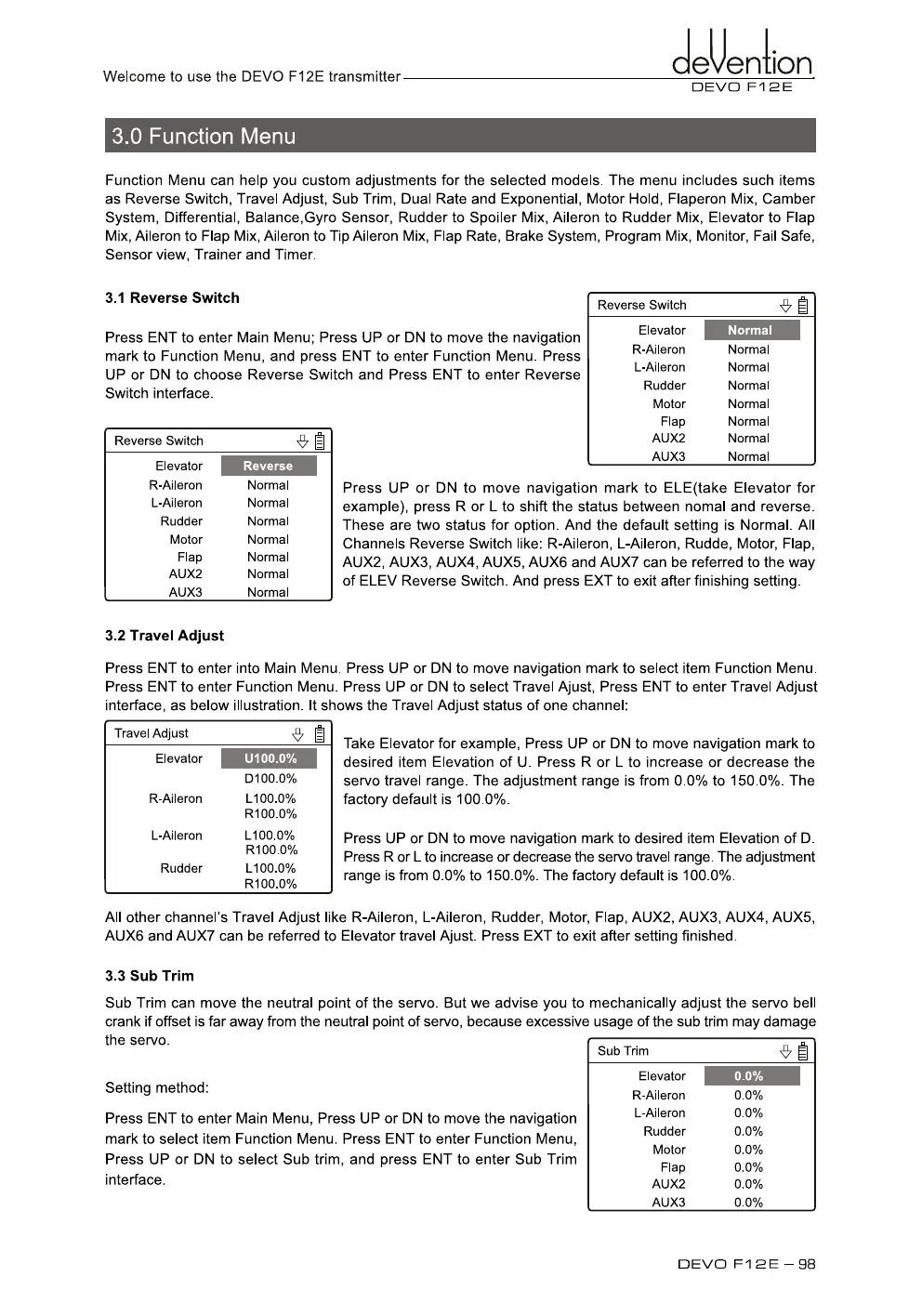 as Reverse Switch, Travel Adjust, Sub Trim, Dual Rate and Exponential, Motor Hold, Flaperon Mix, Camber