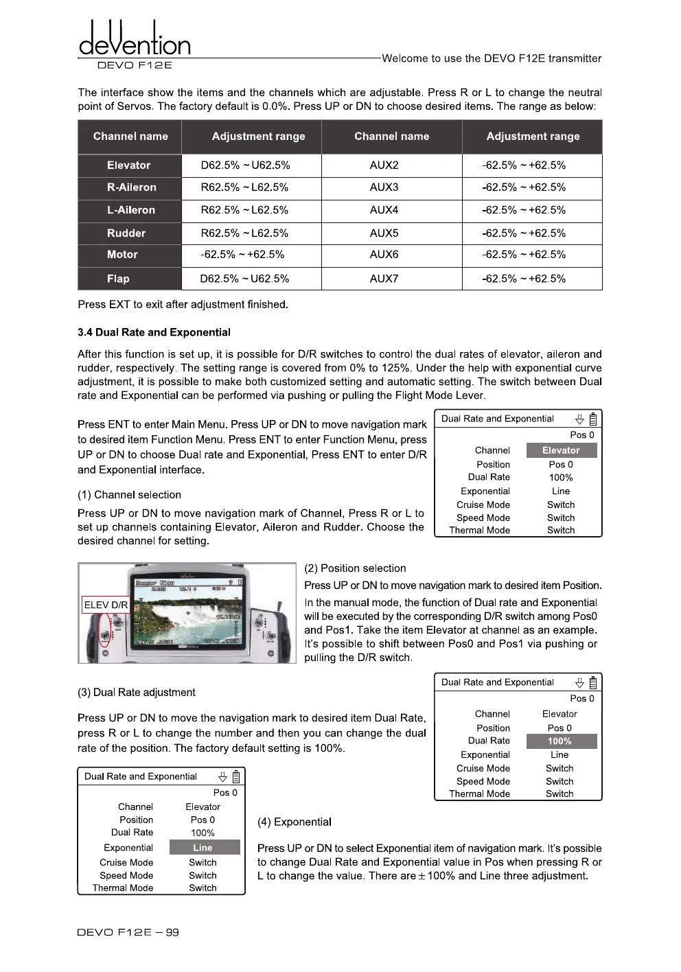 point of Servos. The factory default is 0.0%. Press UP or DN to choose desired items. The range as below: