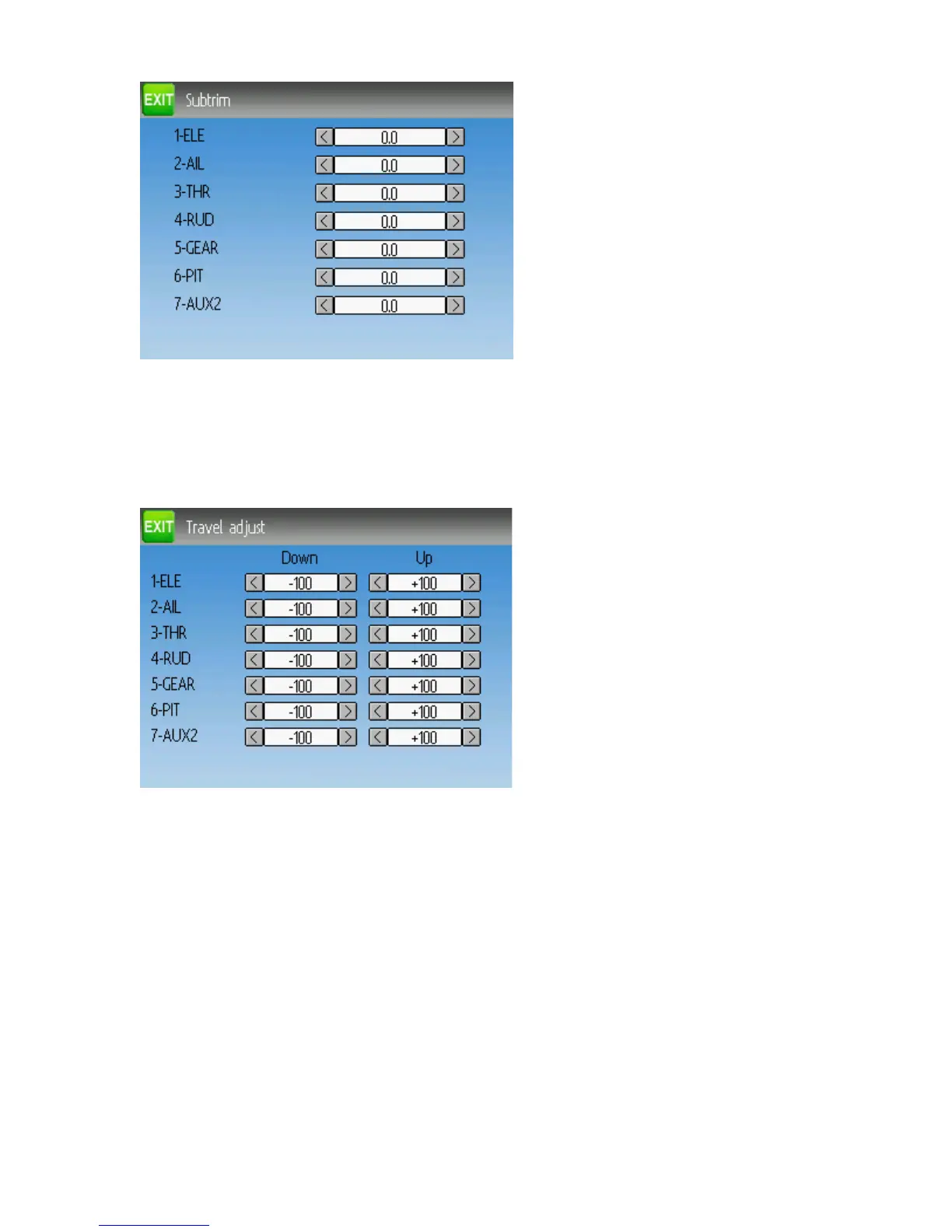 The sub-trim adjust page allows setting the zero-point of the servos for each channel.