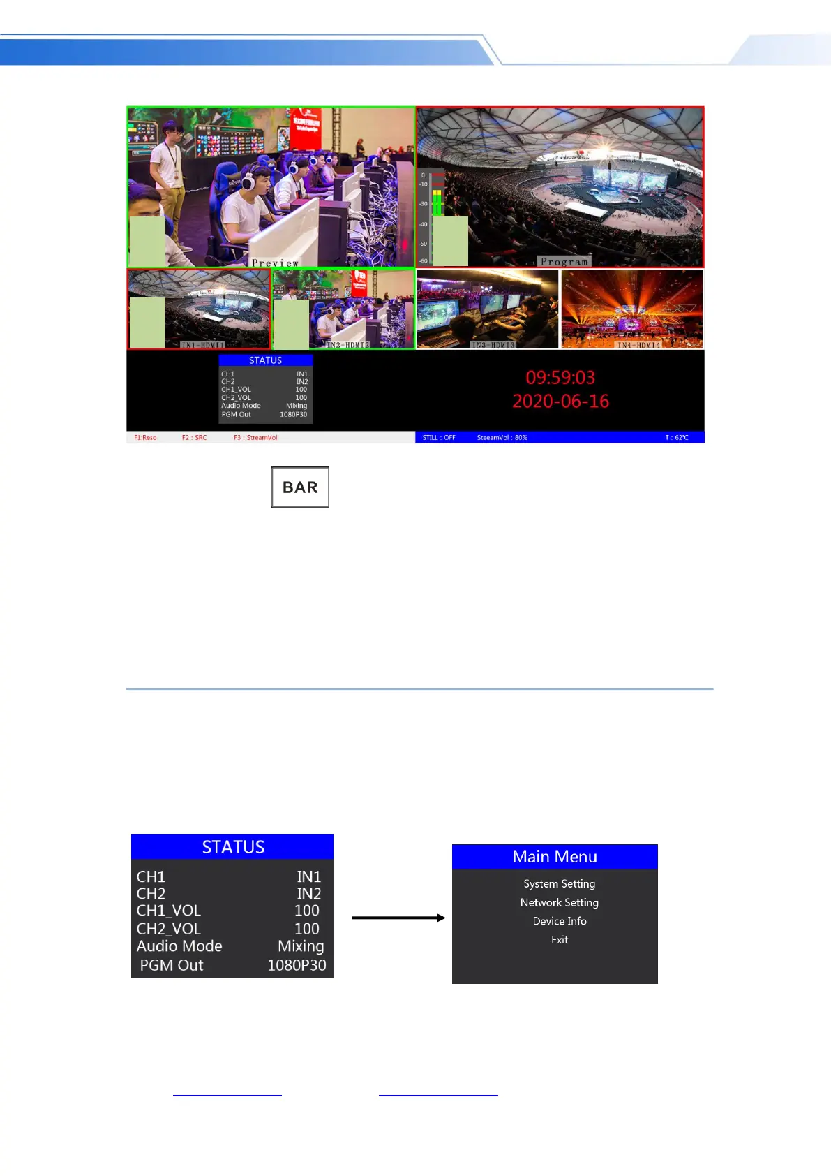 After pressing the BAR button in the key panel, the screen will output color bars.