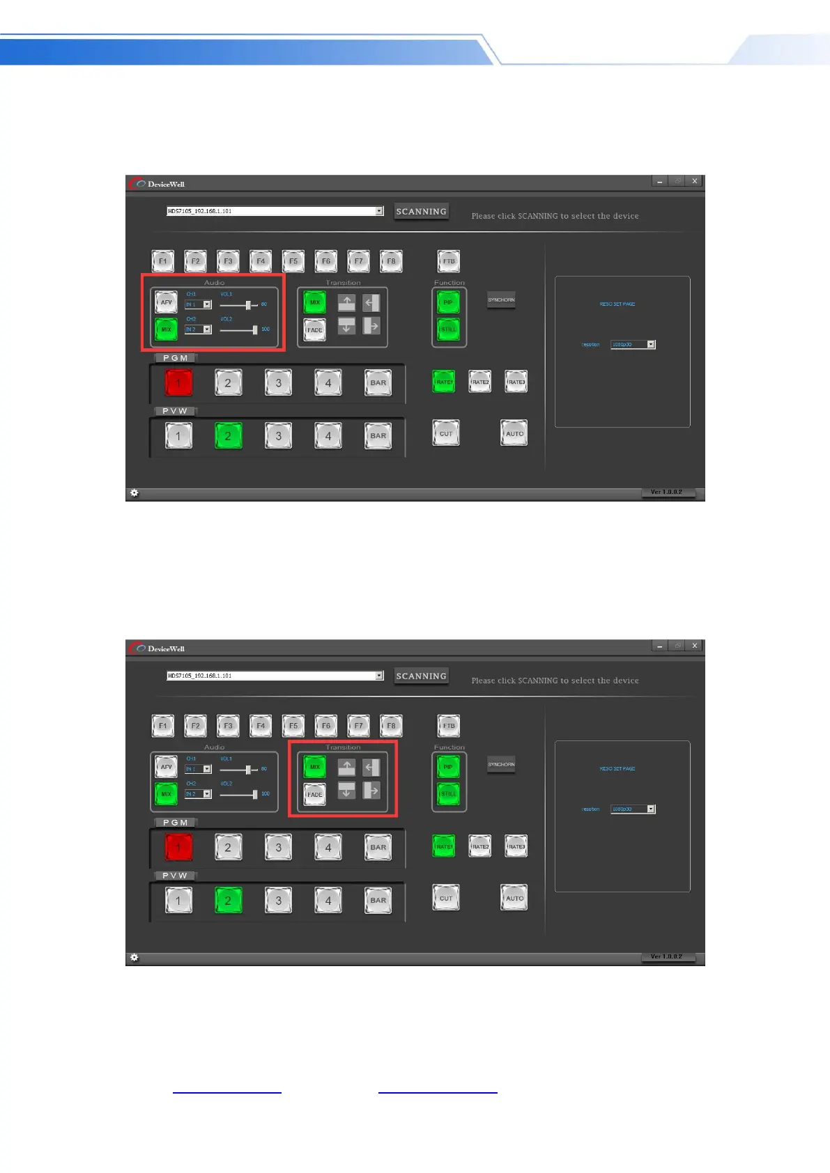 In the transition effect control area, you can press MIX (mixed transition), FADE