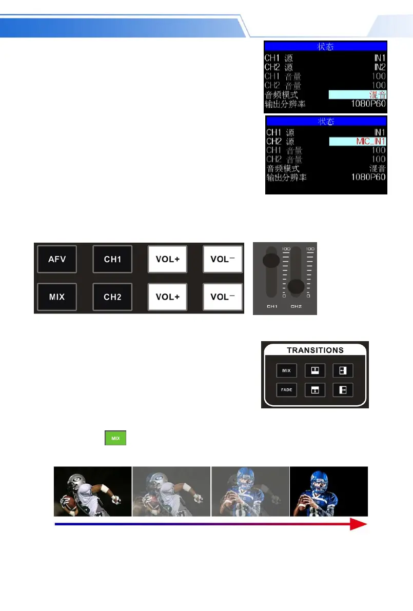 控制音量大小,或者不断上下调整 CH1 和 CH2 的音频推子的位置,对应的菜单部分也可以显示当前音量大小。