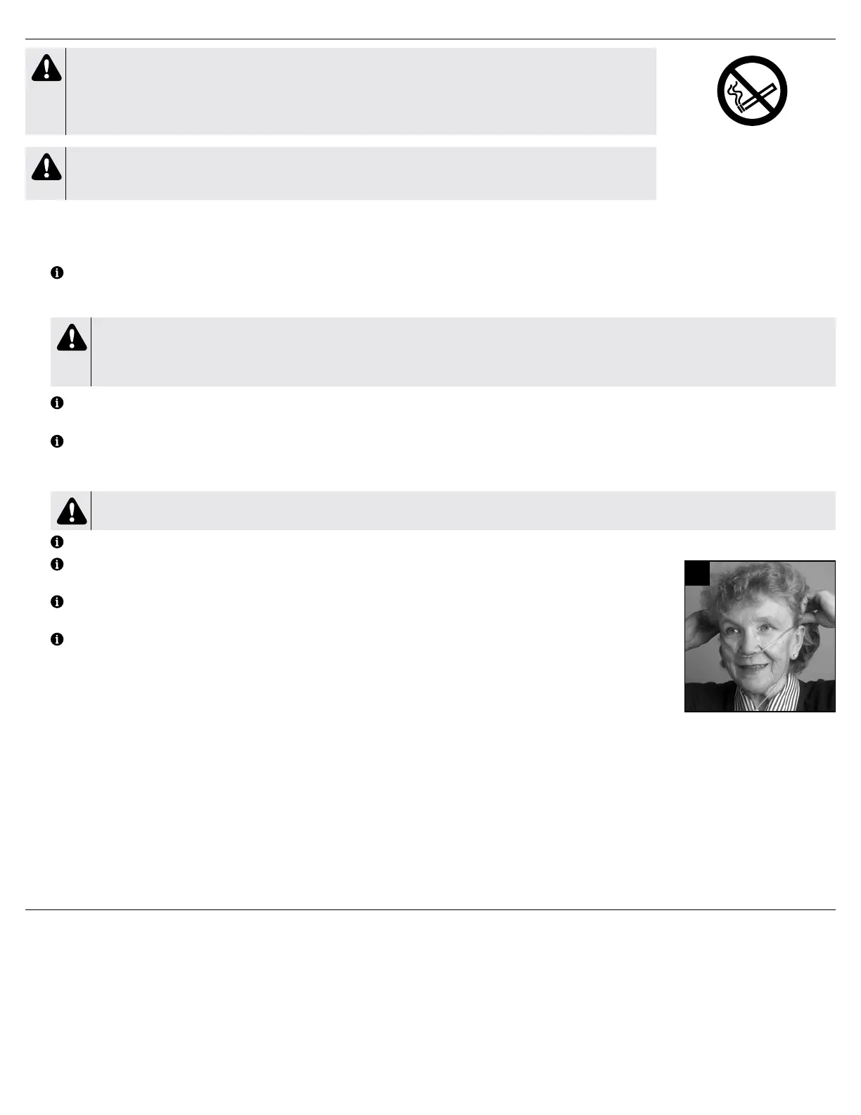 Kyslík podporuje rýchle horenie. Nikdy nefajčite počas používania kyslíkového koncentrátora alebo v blízkosti osoby, ktorá