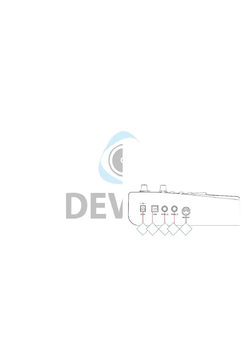 A sustain or switch pedal can be connected to the VersaKey using the Pedal A and B