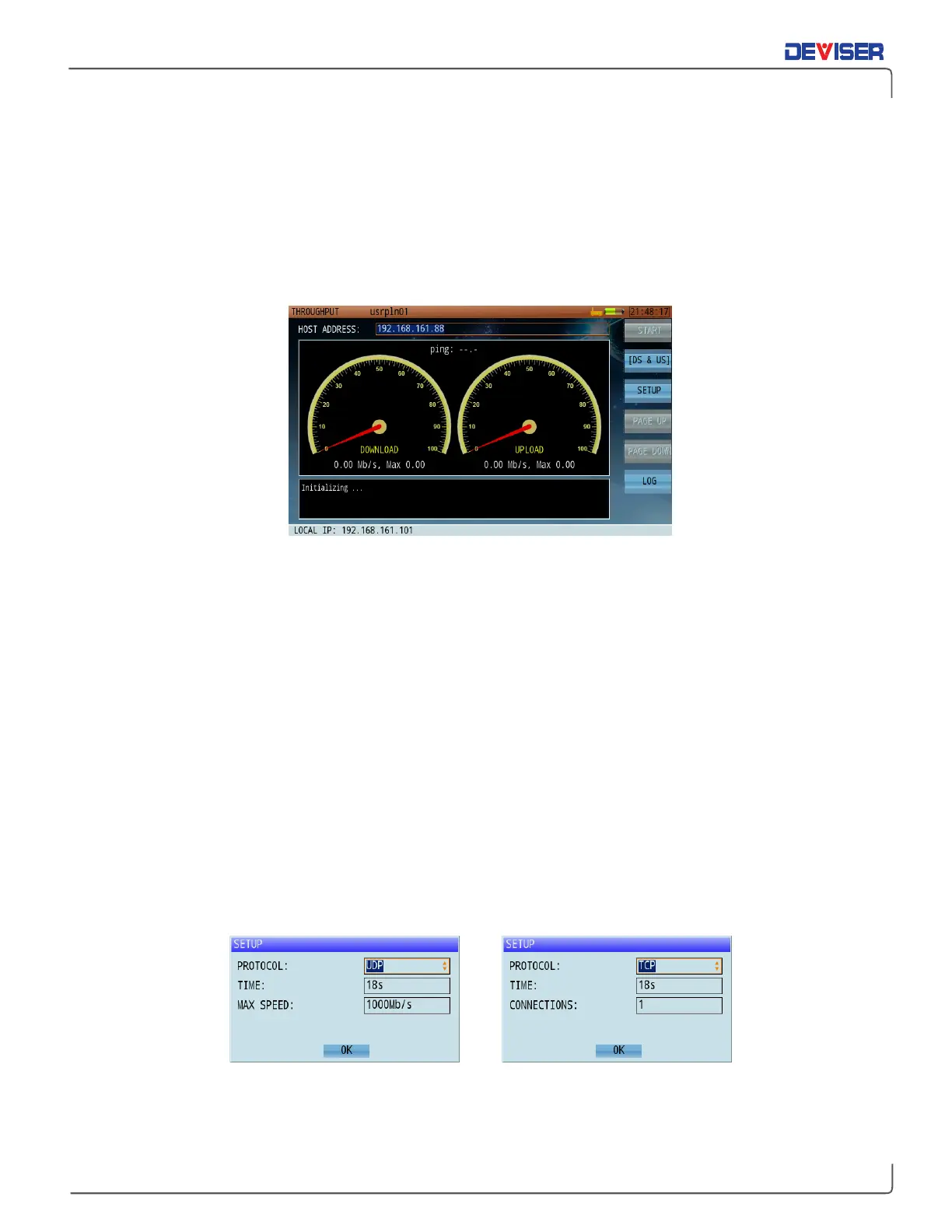Deviser offers a speed test software to assist Throughput. Using a PC installed with the software, deploy