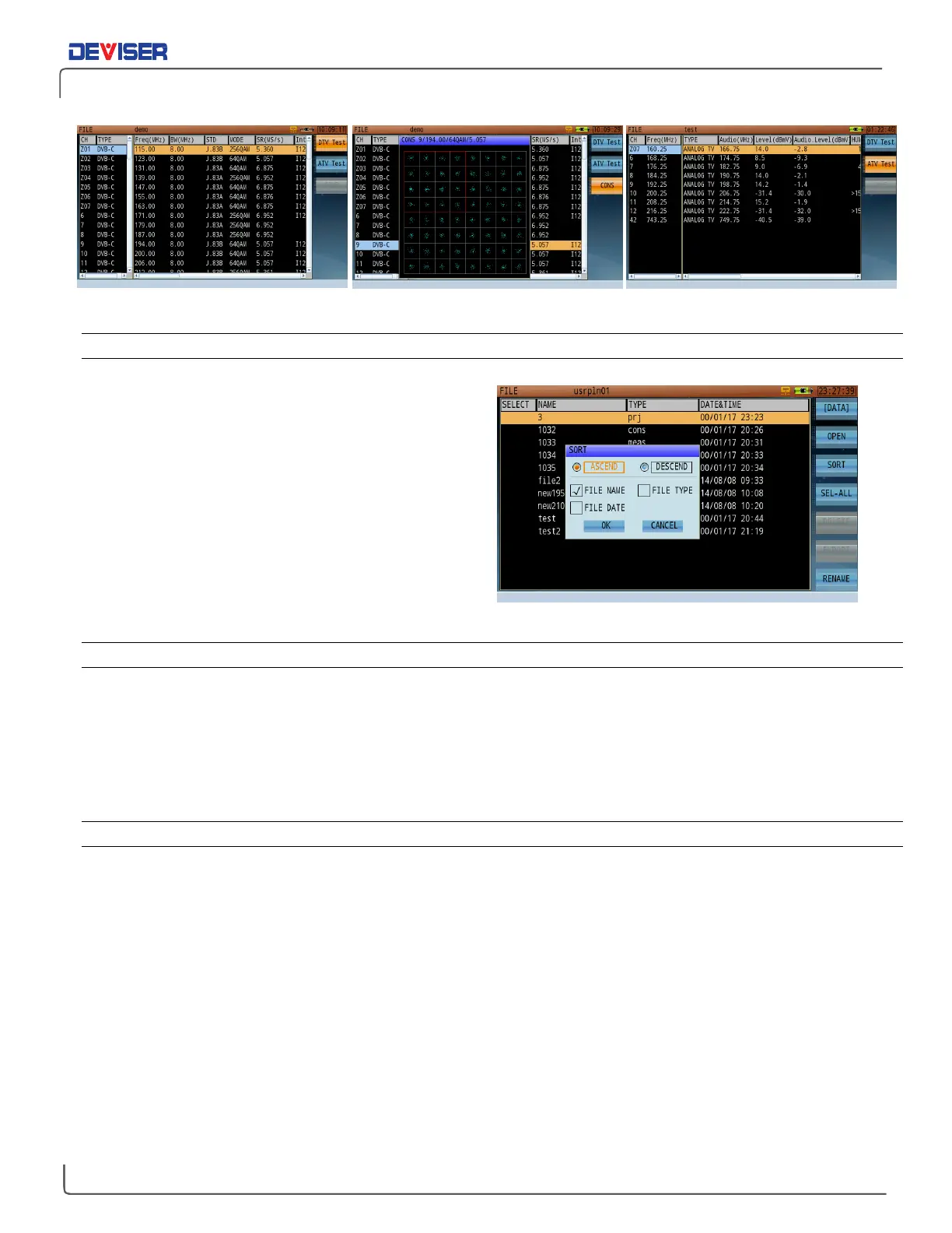 Viewing Auto Test Results: Digital Channel, Constellation, and Analog TV Channel (left to right)