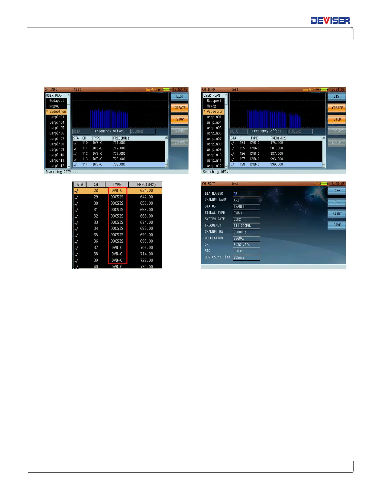 the DOCSIS signal type (with other parameters, such as Symbol Rate & Standard). (See below, bottom-left.)