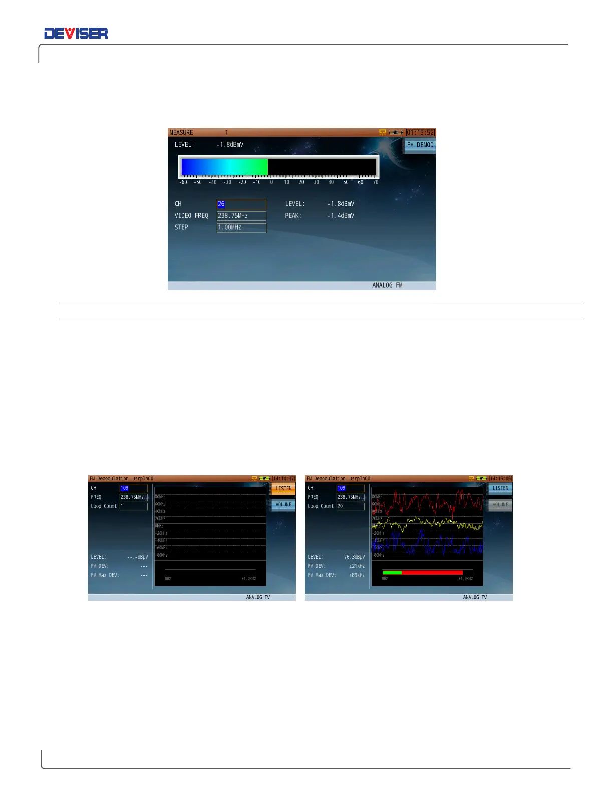 The Analog FM measurement screen, shown below, is primarily used to measure FM radio signal levels.