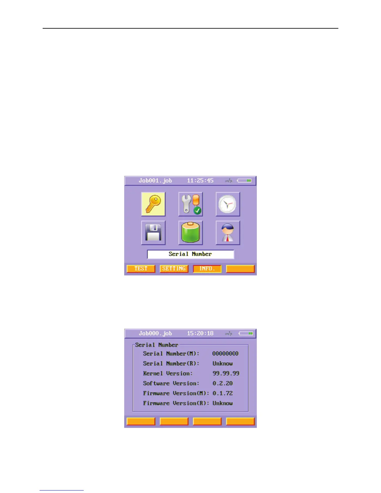 When enter Serial Number information menu, users can see the instrument’s serial number and the version levels of OS Kernel,
