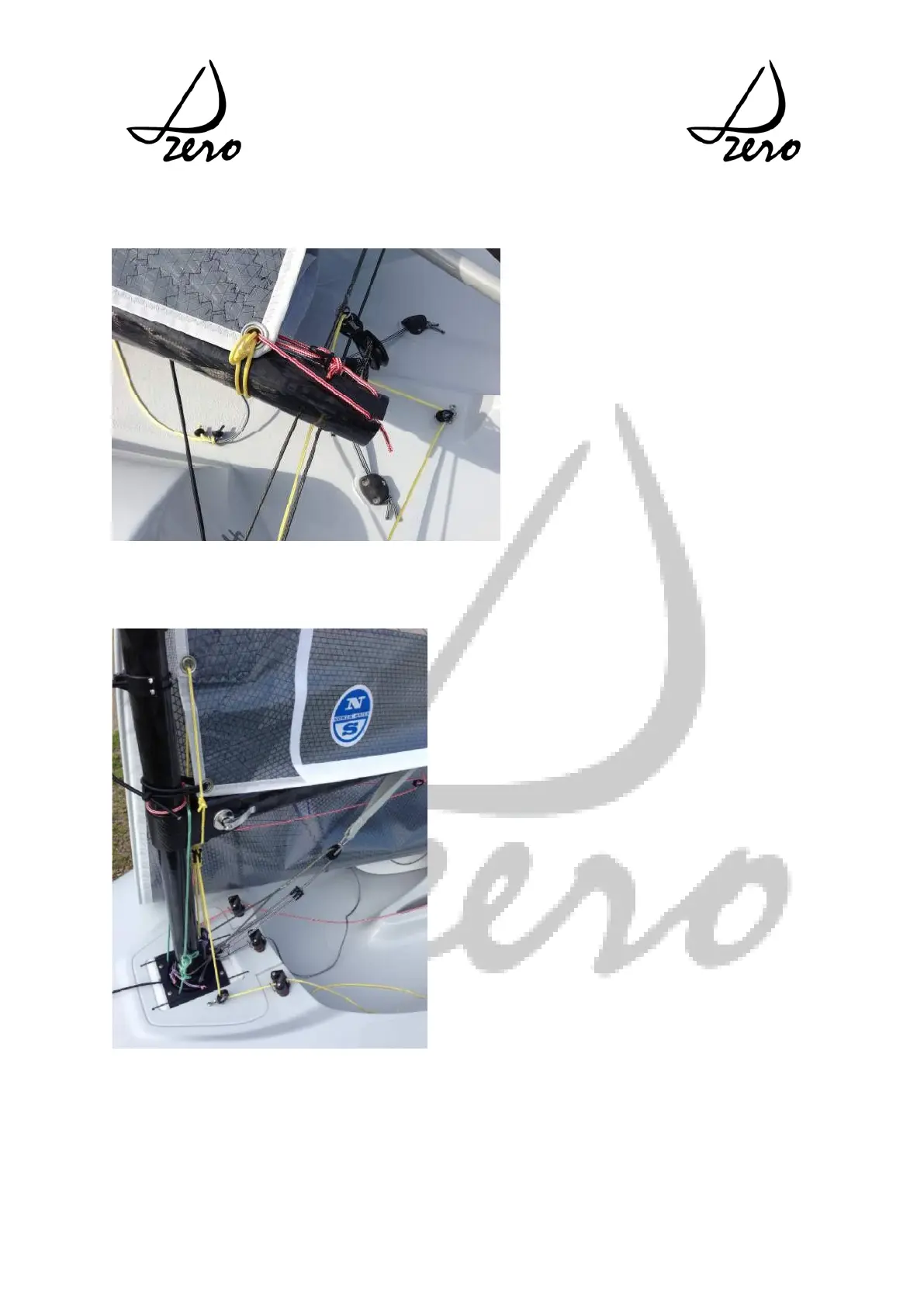 Step 5, Yellow rope supplied on boom for clew downhaul, red rope with floating block is for