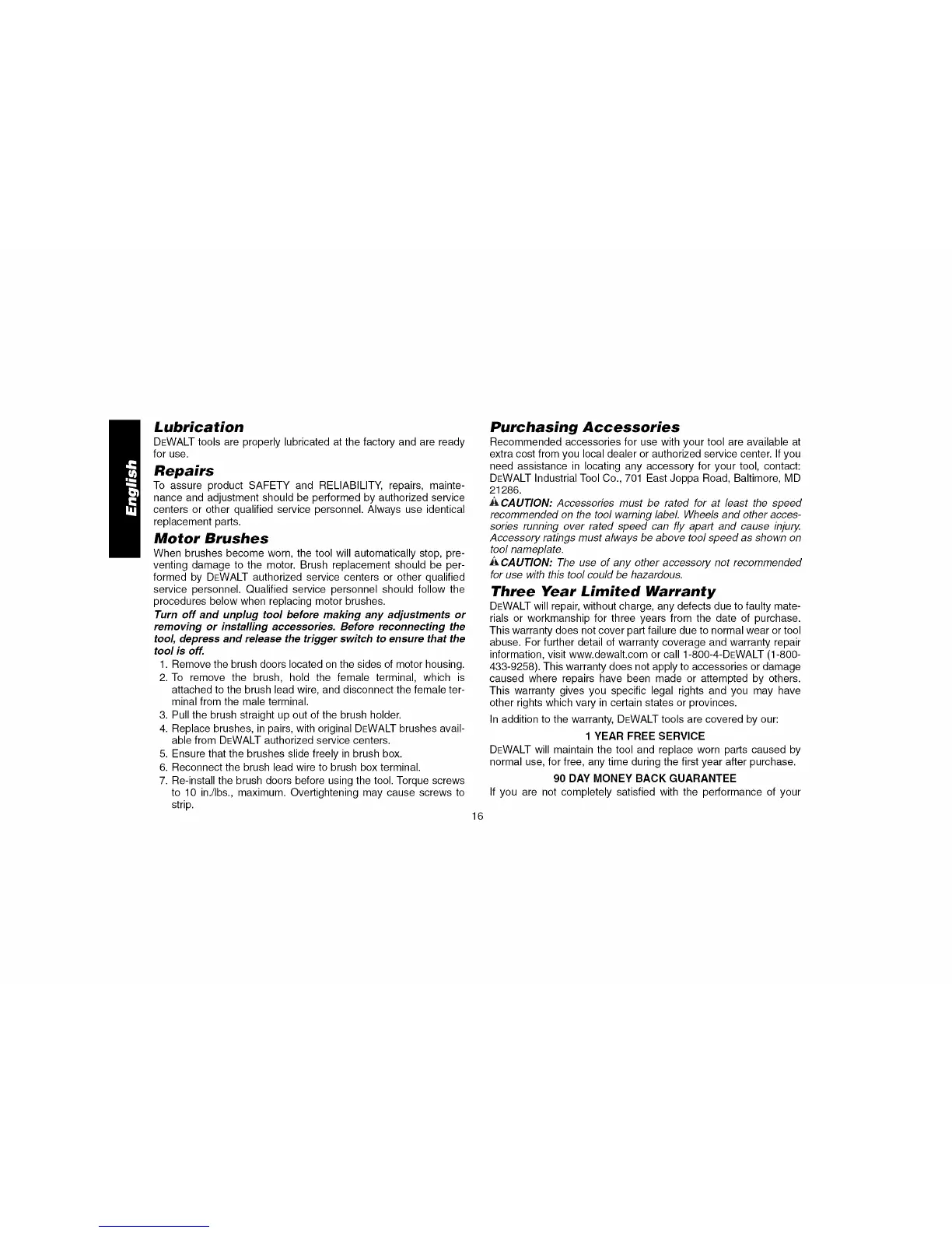 4. Replace brushes, in pairs, with original DEWALT brushes avail-