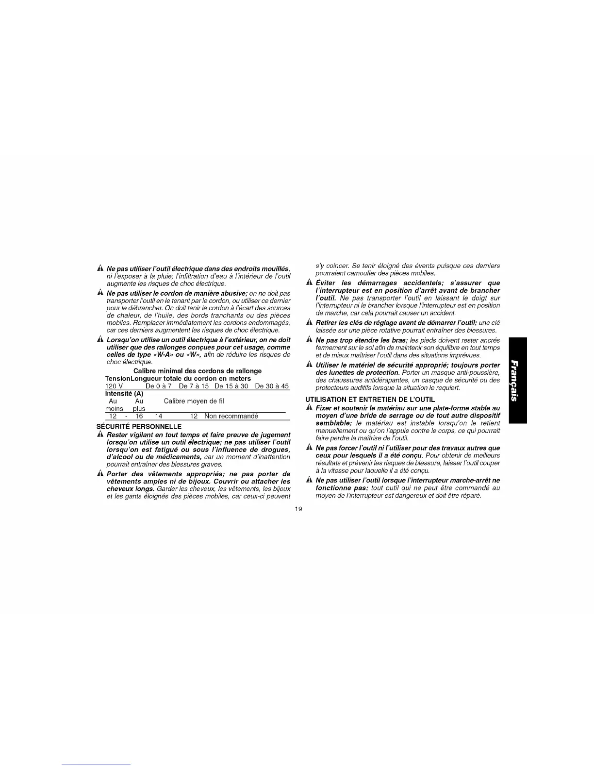 Iorsqu'on utilise un outil electrique; ne pas utiliser I'outil