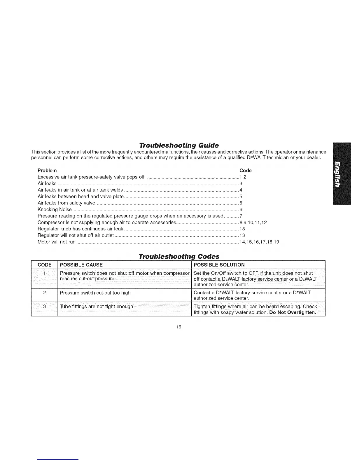 2 Pressure switch cut-out too high Contact a DEWALT factory service center or a DEWALT