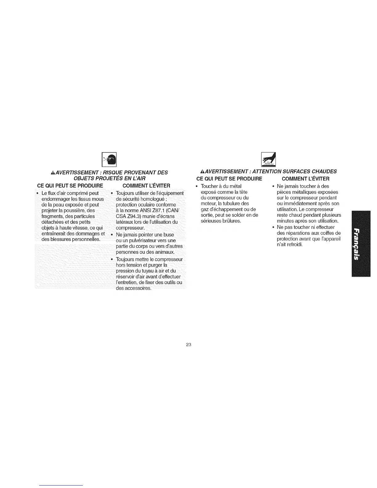 Le flux d'air comprim6 peut • Toujours utiliser de 1'6quipement