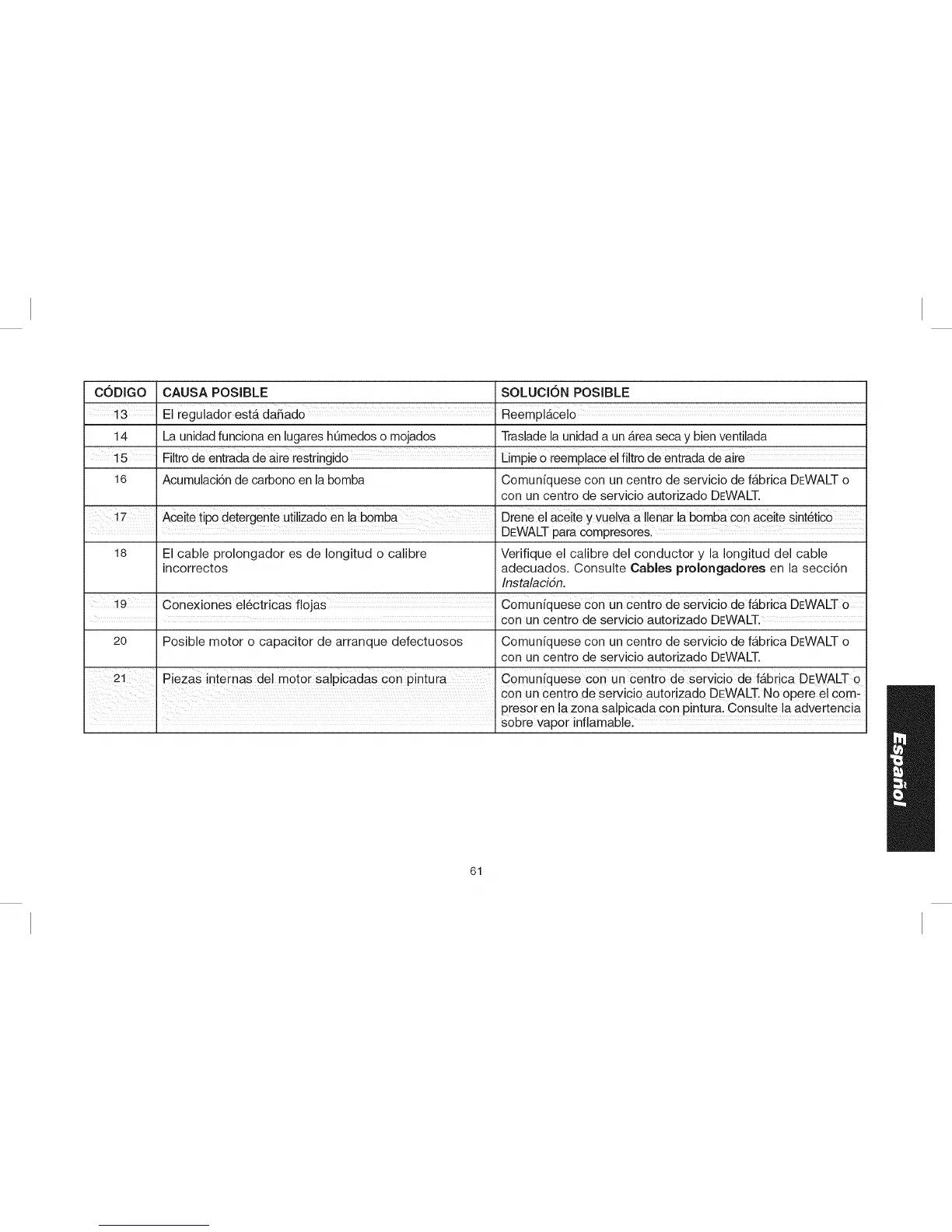 16 Acumulacidn de carbono en la bomba Comuniquese con un centro de servicio de fabrica DEWALT o