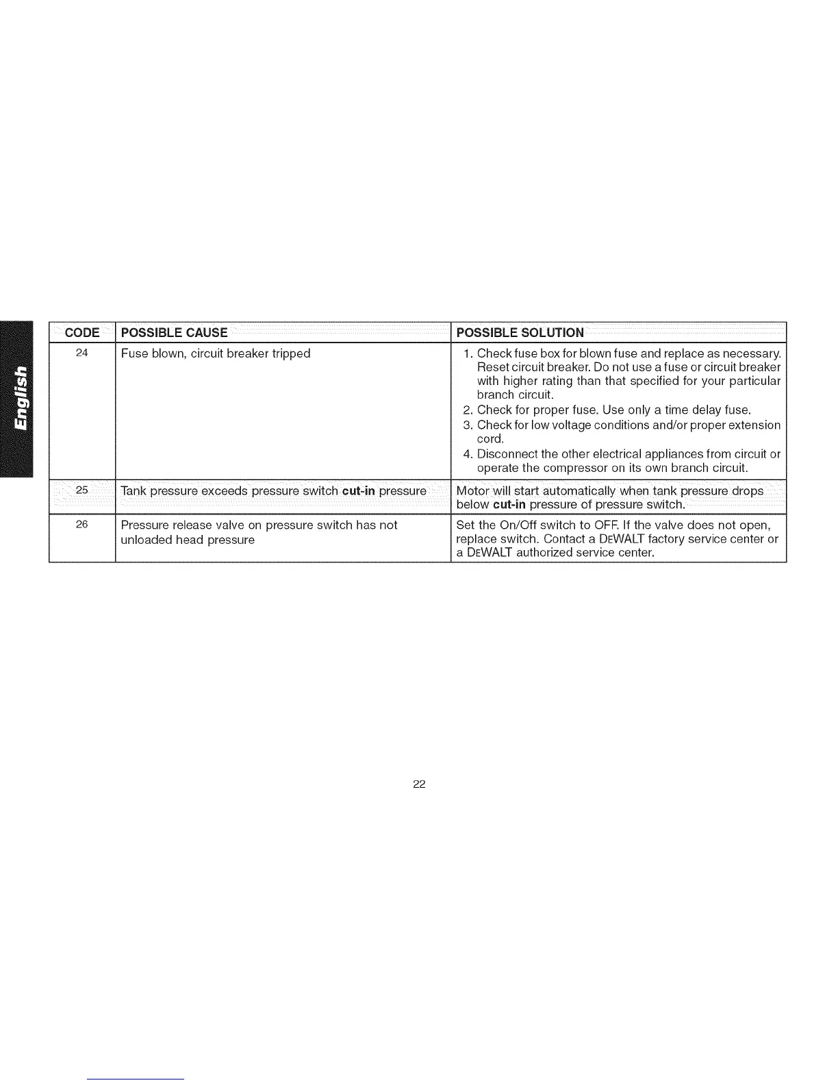 24 Fuse blown, circuit breaker tripped 1. Check fuse box for blown fuse and replace as necessary.