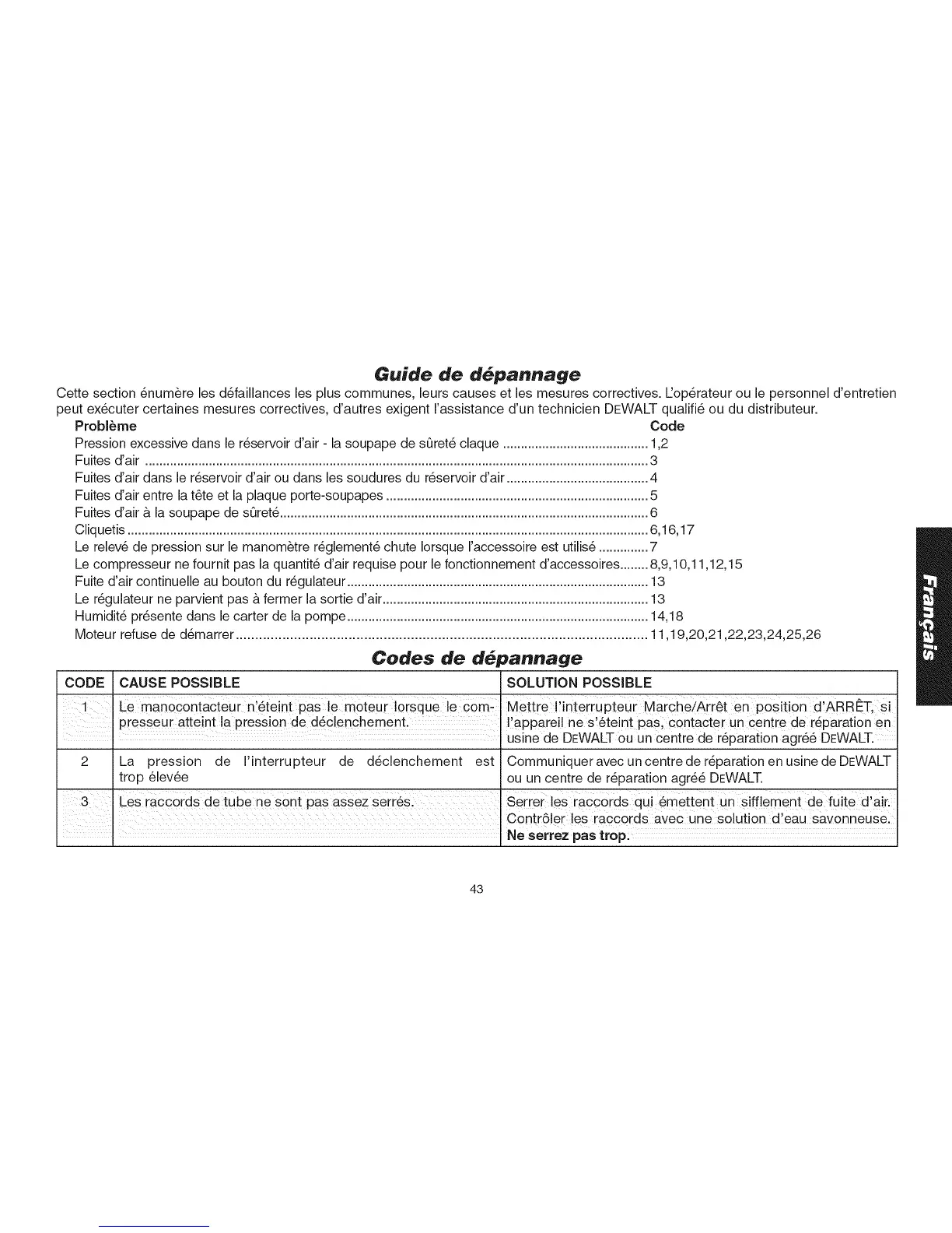 Le compresseur ne fournit pas la quantit6 d'air requise pour le fonctionnement d'accessoires ........8,9,10,11,12,15