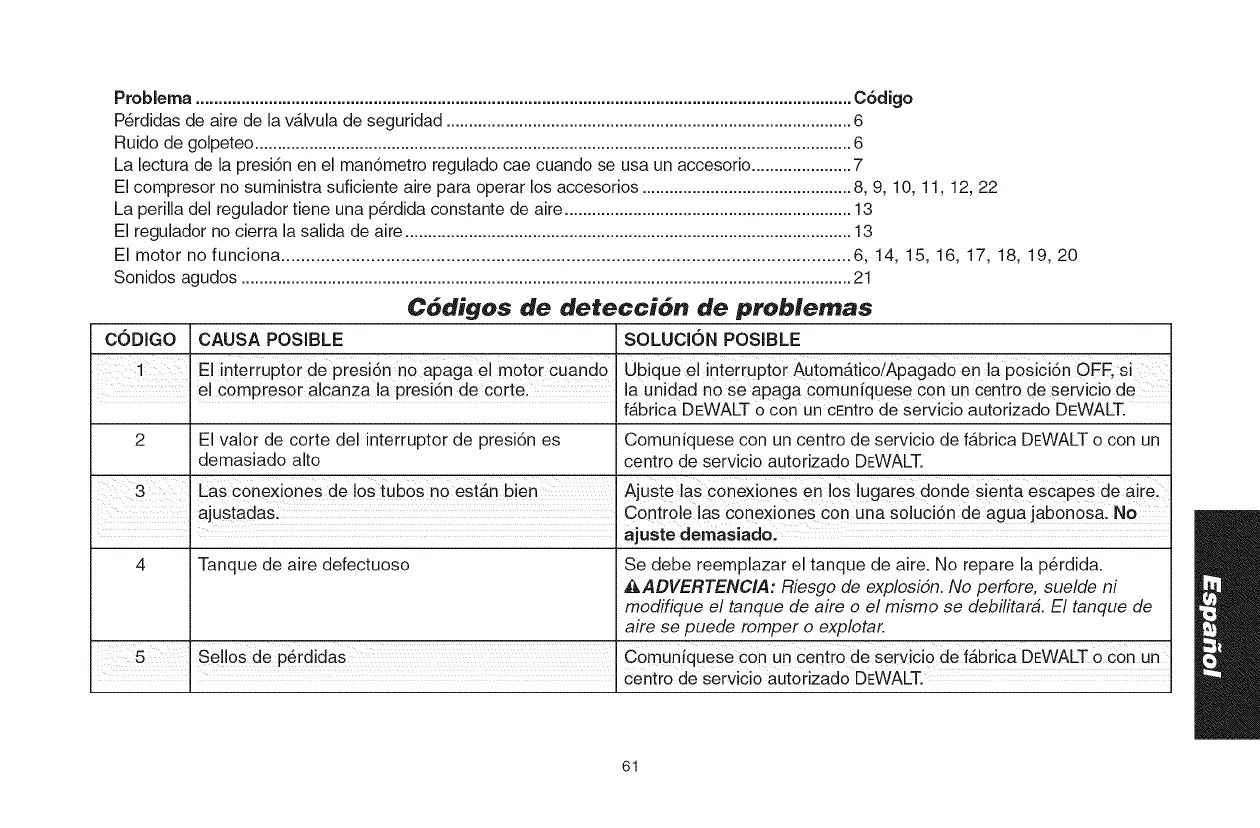 El compresor no suministra suficiente aire para operar los accesorios .............................................. 8, 9, 10, 11, 12, 22