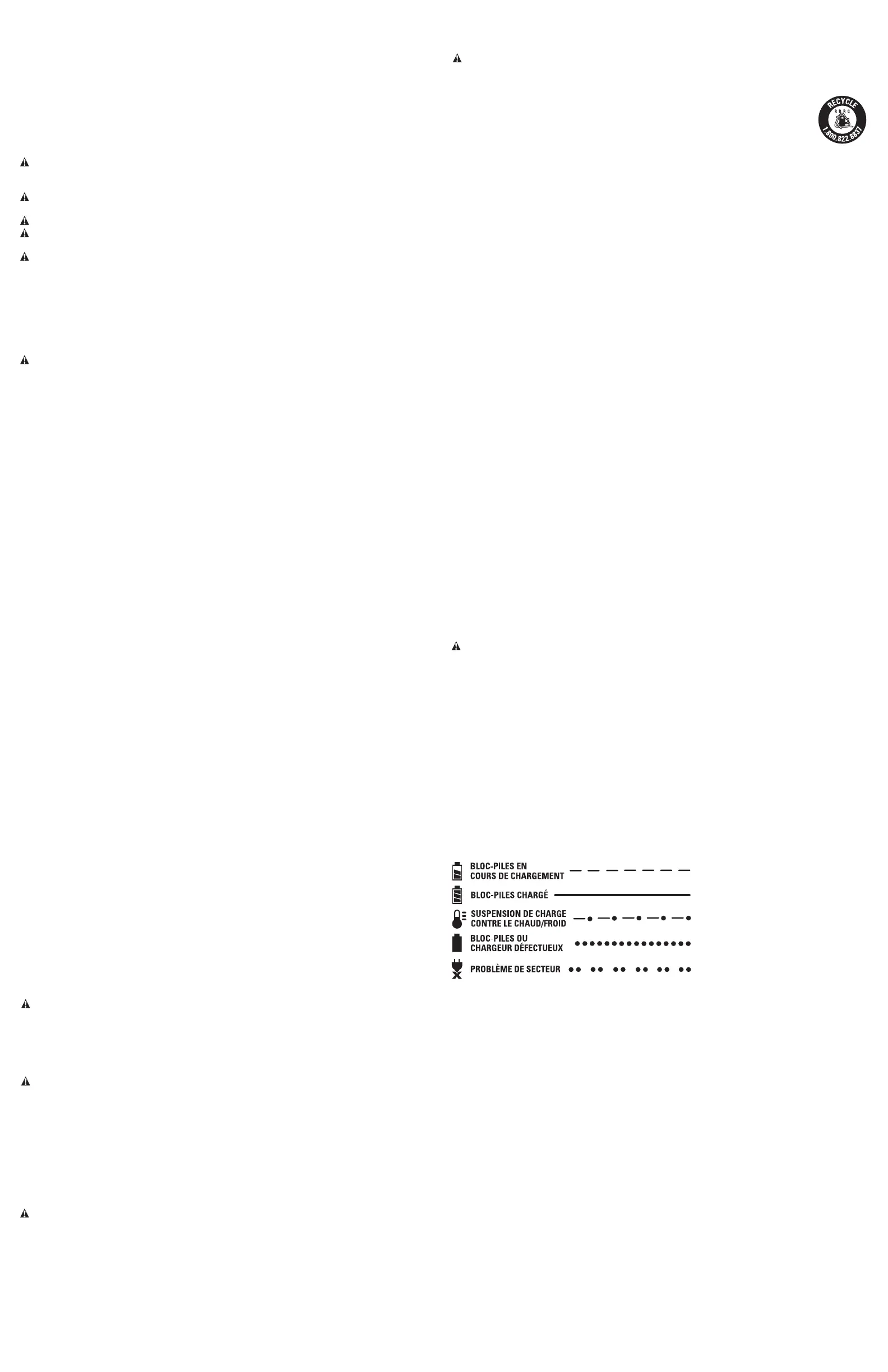 AVERTISSEMENT: ne pas recharger un bloc-piles en milieu déflagrant, il y a risque d’incendie.
