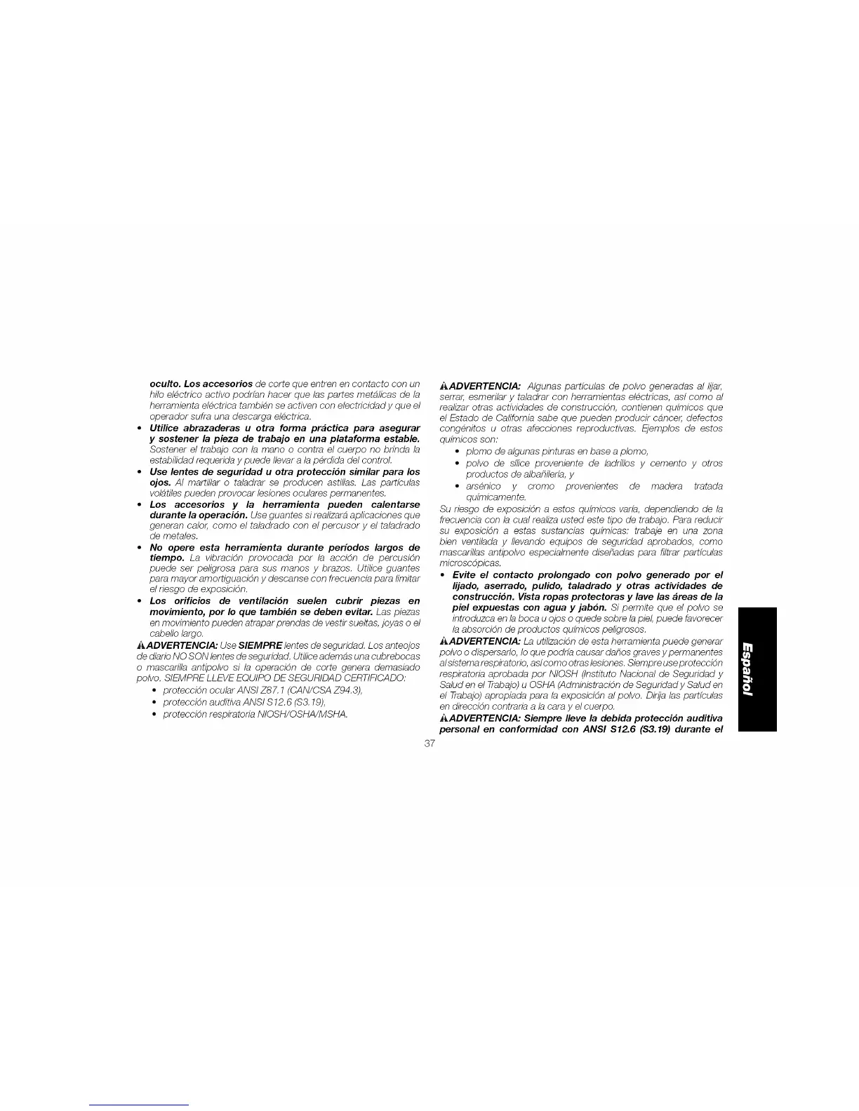 polvo. SIEMPRE LLEVE EQUIPO DE SEGURIDAD CERTIFICADO:
