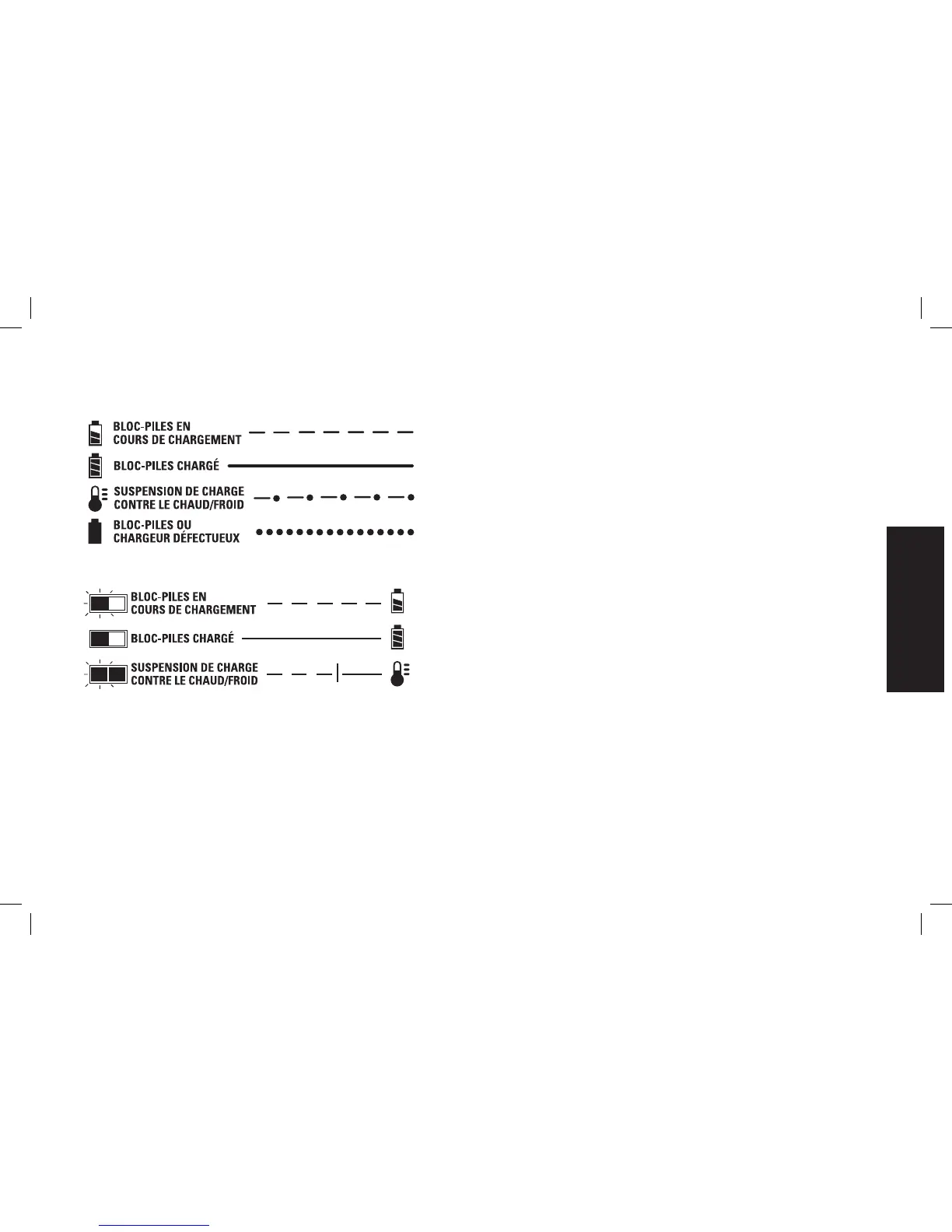 s’allumer ou en affichant bloc-piles ou chargeur défectueux.