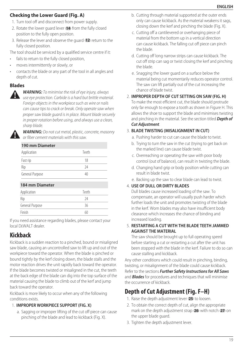 workpiece toward the operator. When the blade is pinched or