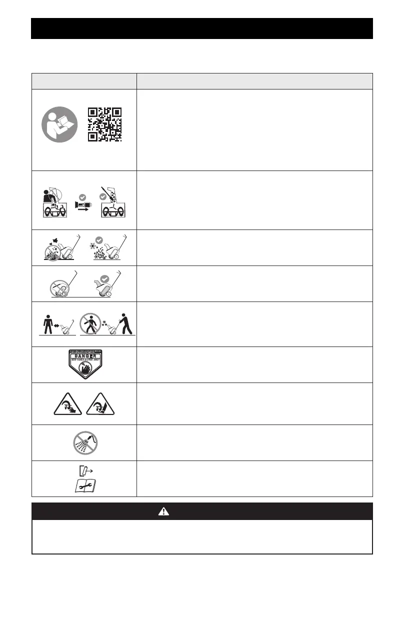 Cette page illustre et explique les symboles de sécurité pouvant figurer sur cette souffleuse à neige. Assurez-vous de lire, comprendre