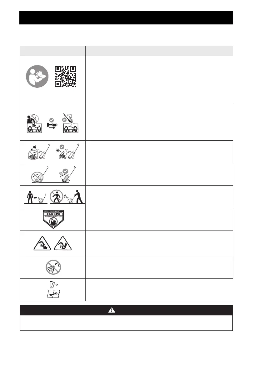 This page depicts and describes safety symbols that may appear on this snow blower. Read, understand, and follow all instructions on