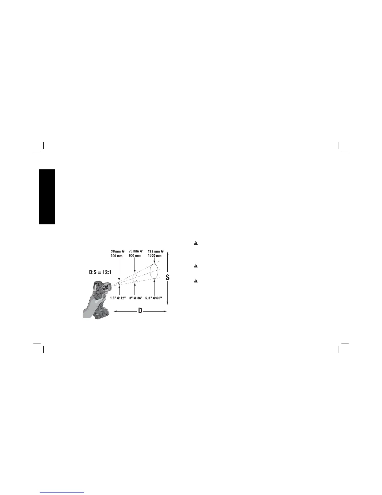 12” (305mm) away from the object it will measure 1” (25mm). The