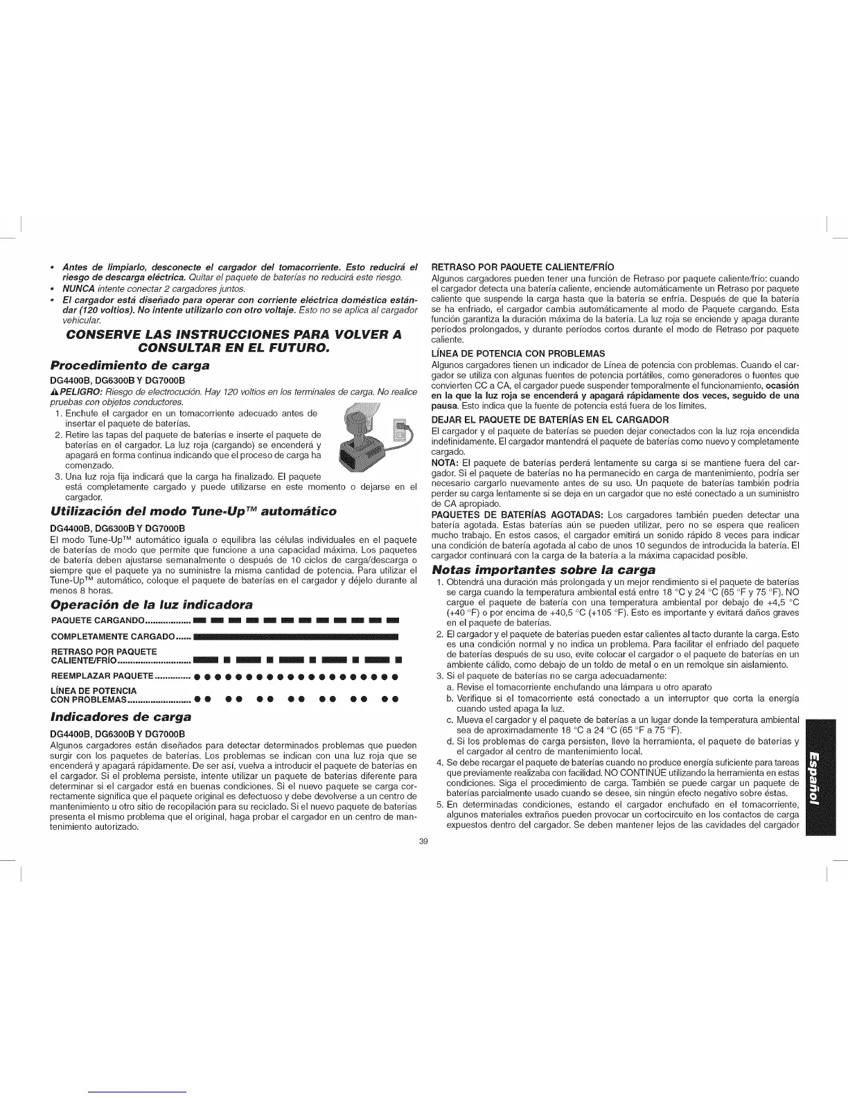 Tune-Up TM autom&tico, coloque el paquete de baterias en el cargador y d6jelo durante al