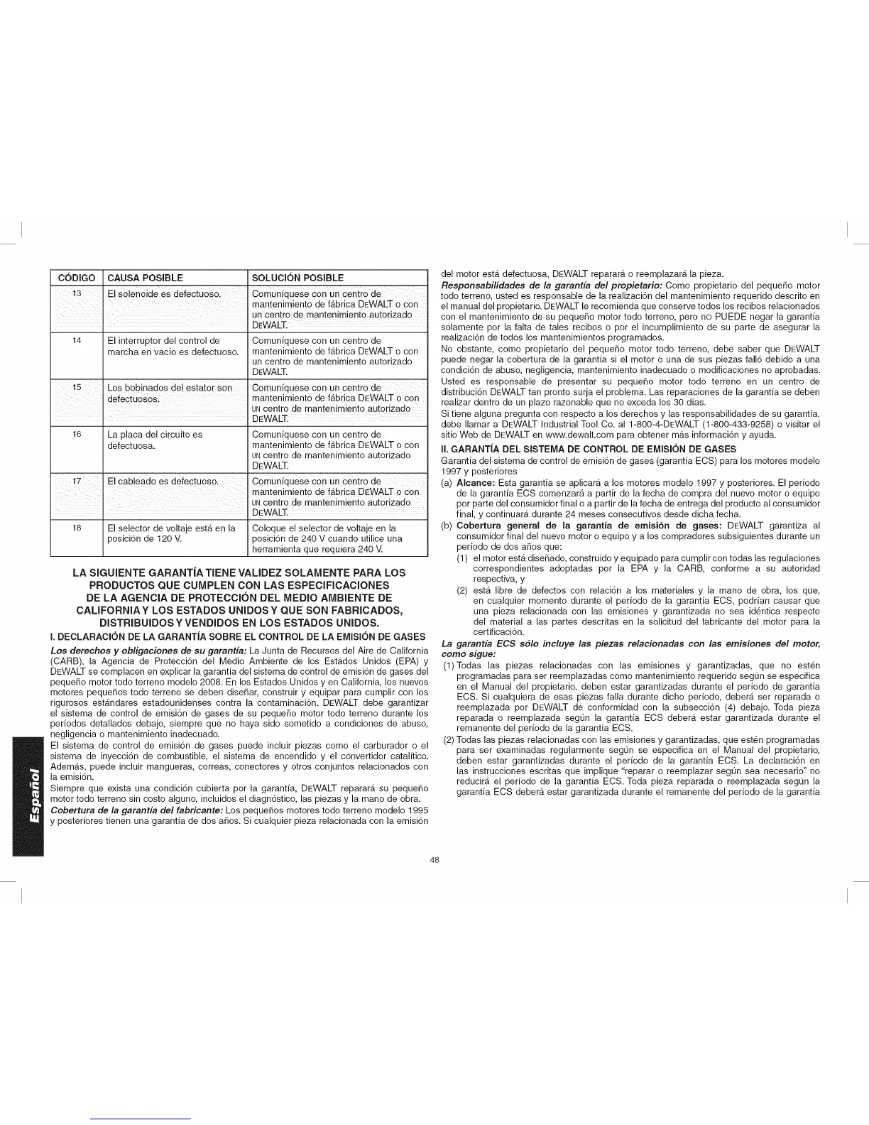 DEWALT se complacen en explicar la garanfia del sistema de control de emisi6n de gases del