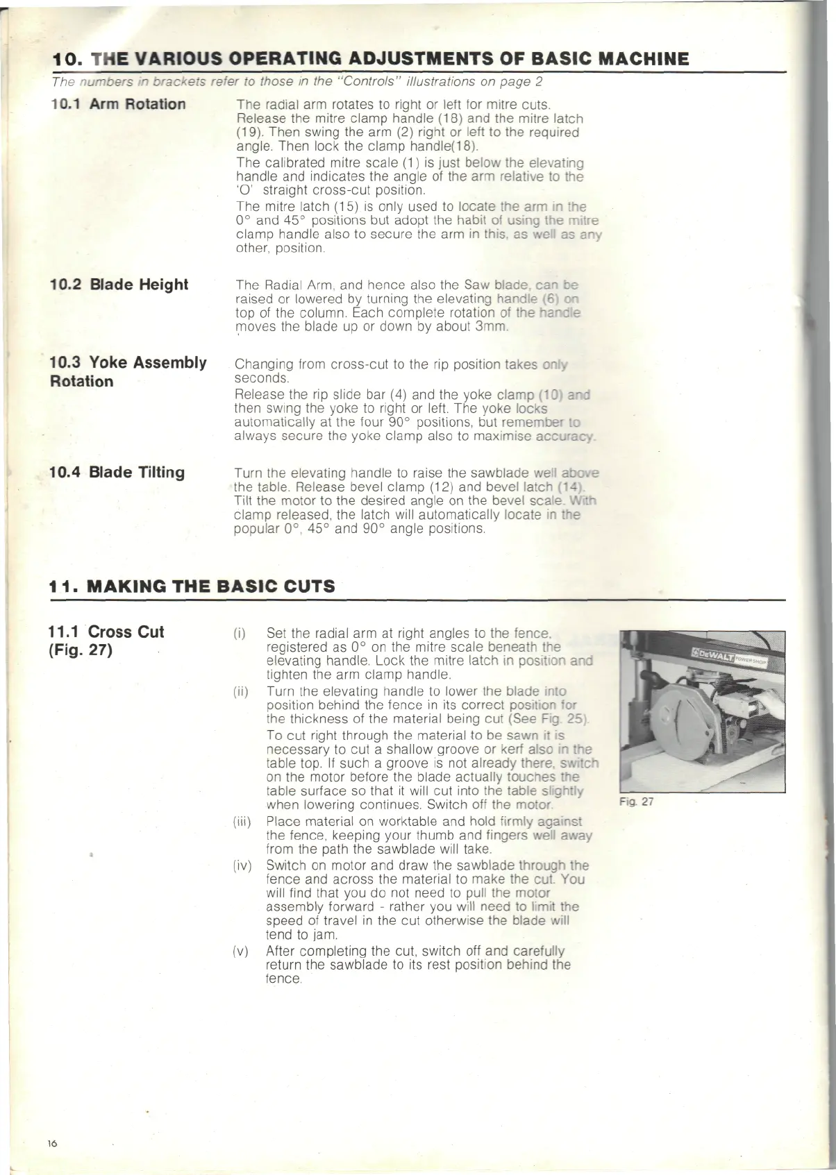 DeWalt DW1503 - 10 The Various Operating Adjustments of Basic Machine; Arm Rotation; Blade Height; Yoke Assembly Rotation