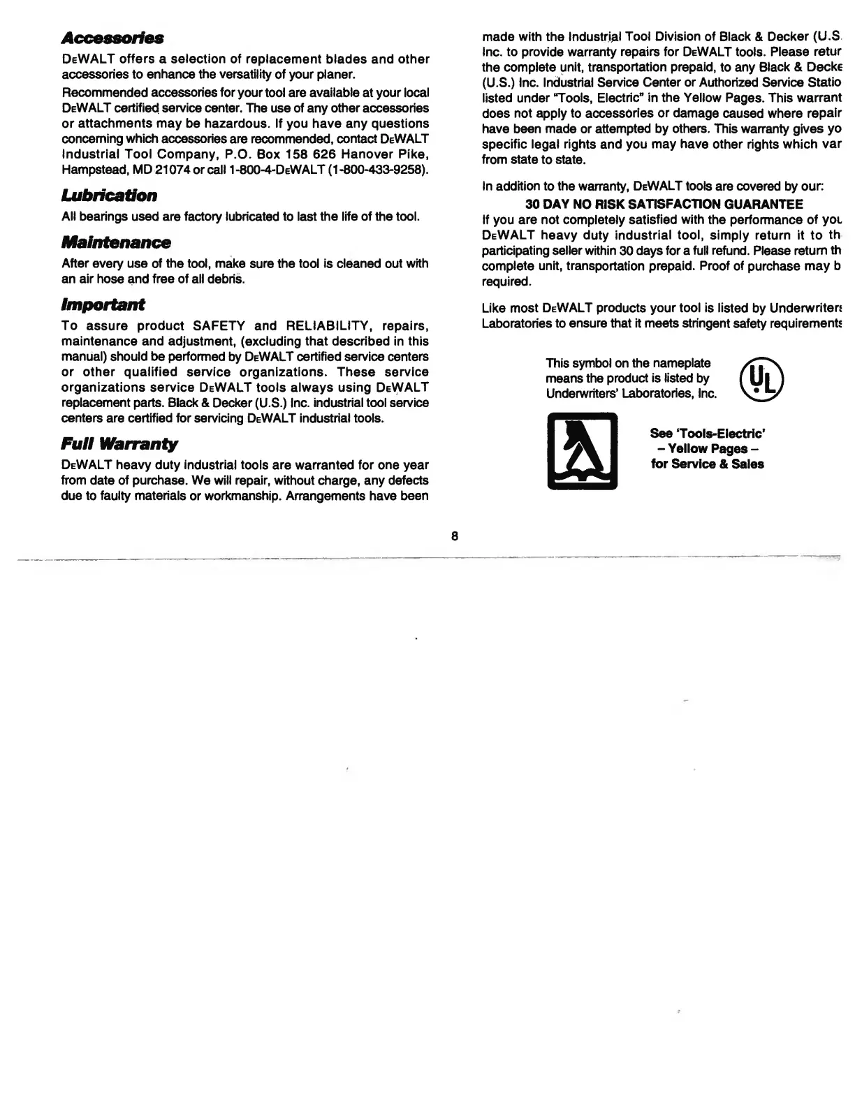 DeWalt DW675 - Accessories; Lubrication; Maintenance; Full Warranty