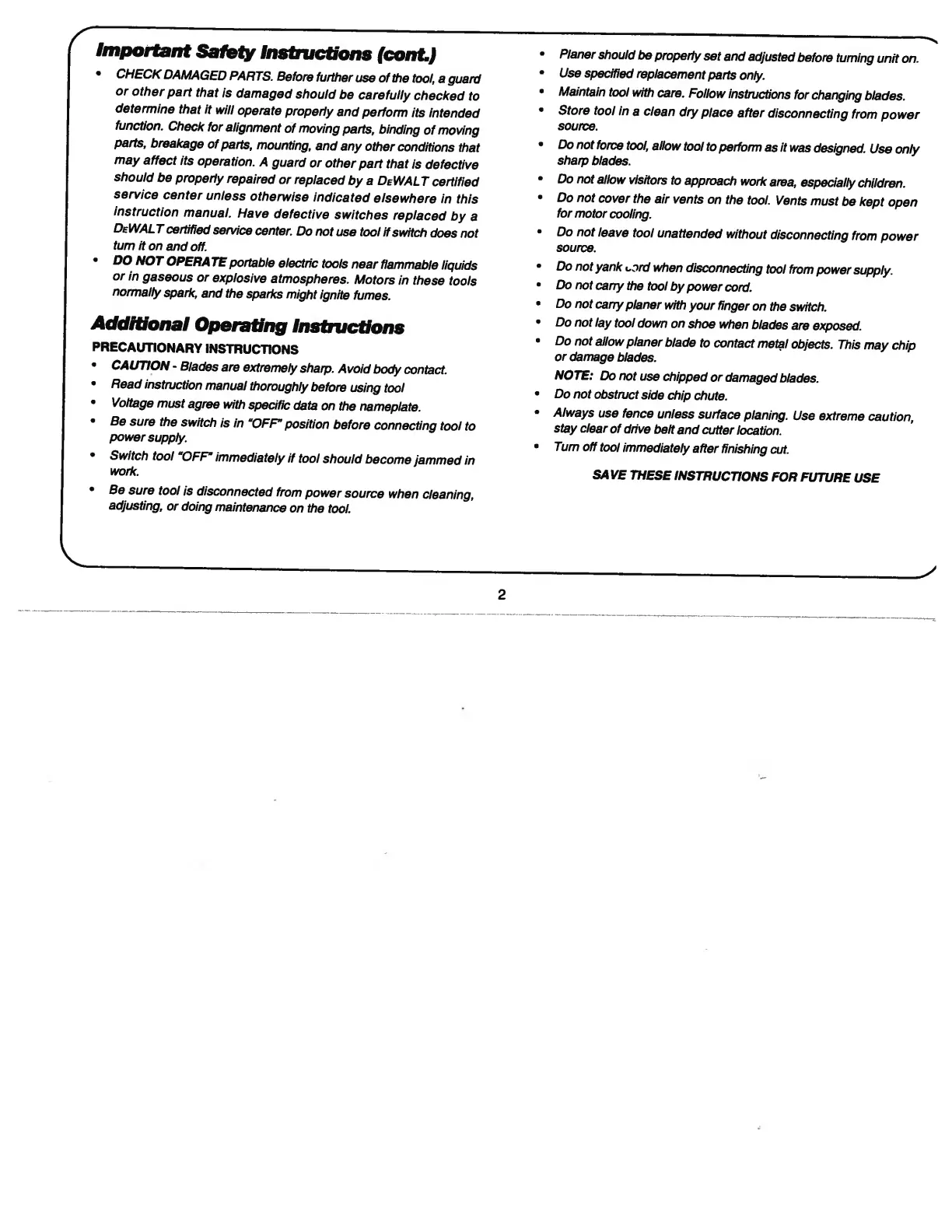 DeWalt DW675 - Additional Operating Instructions; Precautionary Instructions