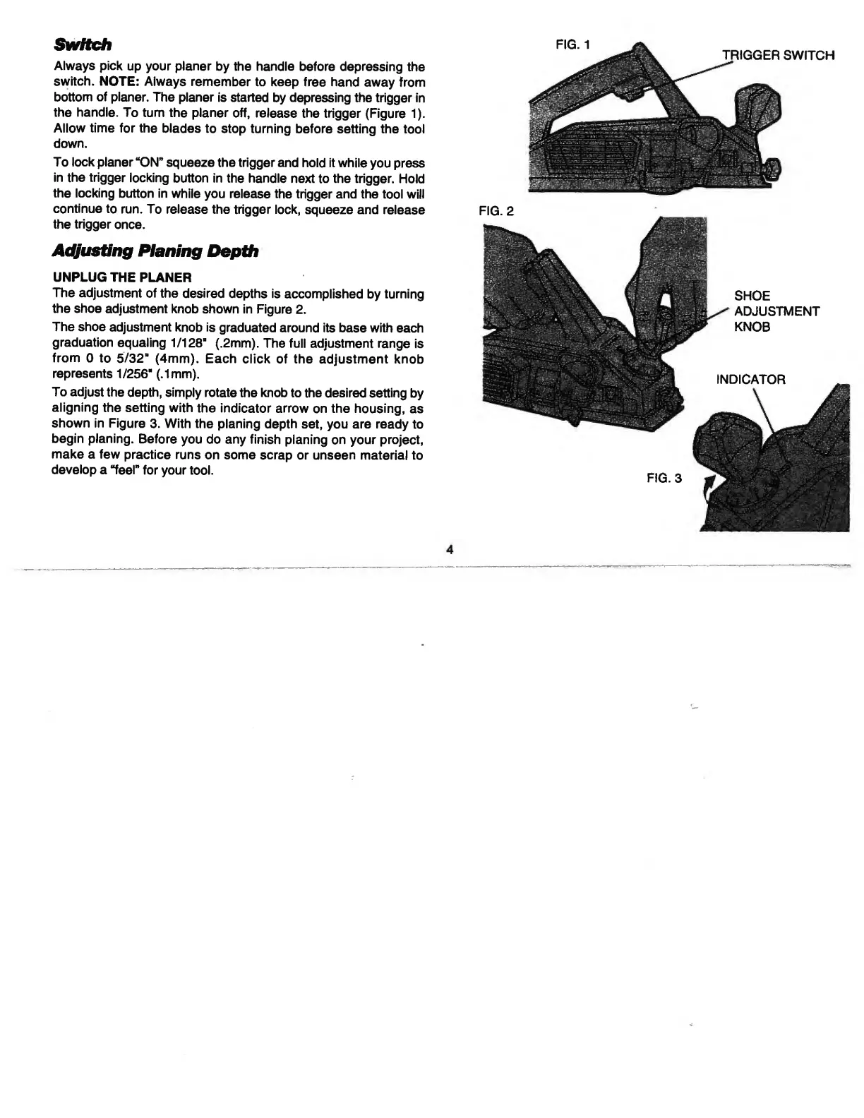 DeWalt DW675 - Switch; Adjusting Planing Depth