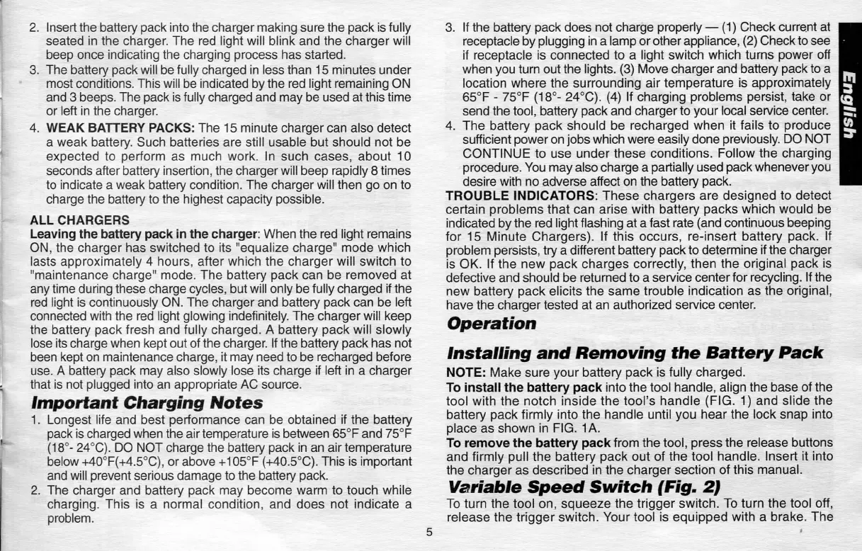 DeWalt DW983 - Battery Charging and Tool Setup; Battery Charging Notes and Troubleshooting; Installing and Removing Battery Packs; Variable Speed Switch Operation