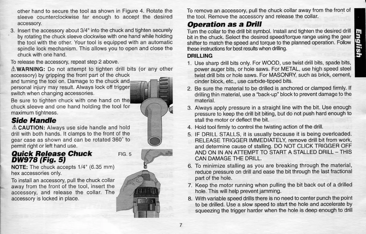 DeWalt DW988 - Accessory and Operation Details; Side Handle Usage; Quick Release Chuck DW978; Operation as a Drill