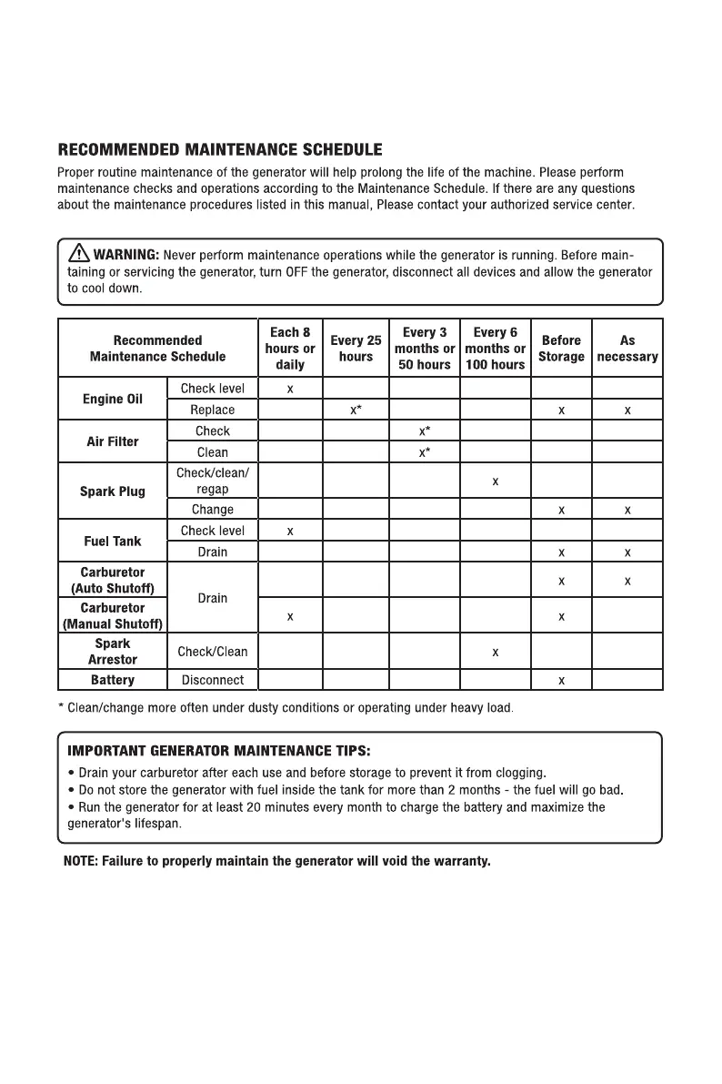 DeWalt DXGNi20E - MAINTENANCE; Recommended Maintenance Schedule