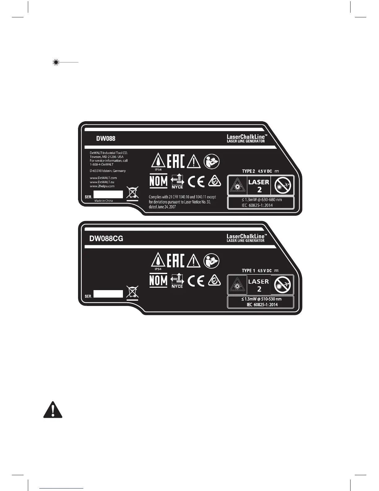 , DW088, sont des appareils laser de classe II (2) et sont conformes aux