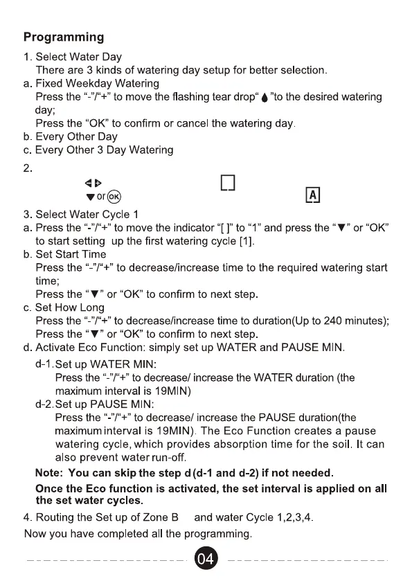 Dewenwils HDWT03A - Programming the Timer; Water Day Selection; Zone and Water Cycle Setup; Eco Function Setup