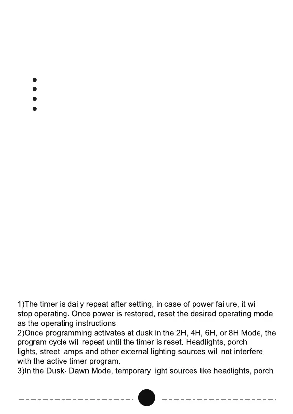 1. Timer dial: 2 to 8 hours or dusk to dawn and daily repeat function.