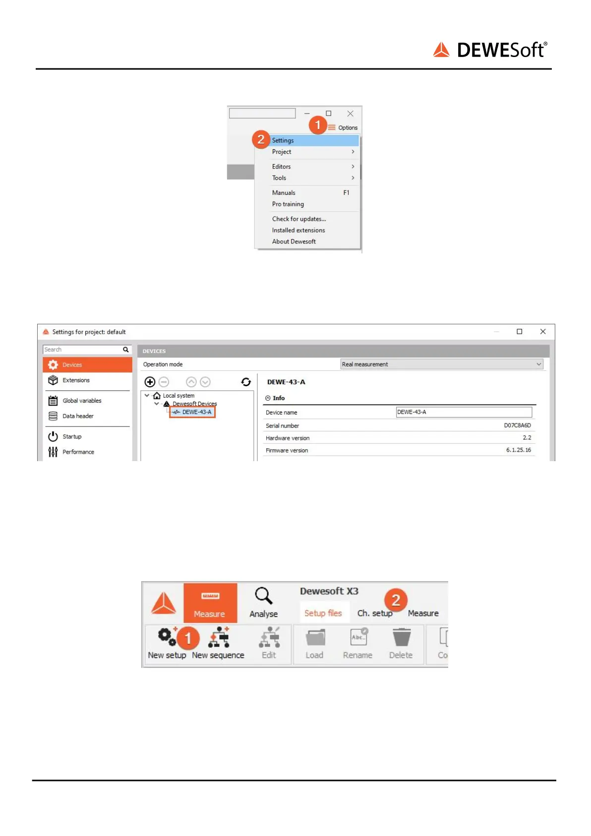 When DewesoftX® has started up, you will be in the Measure mode and see the Setup files list or you