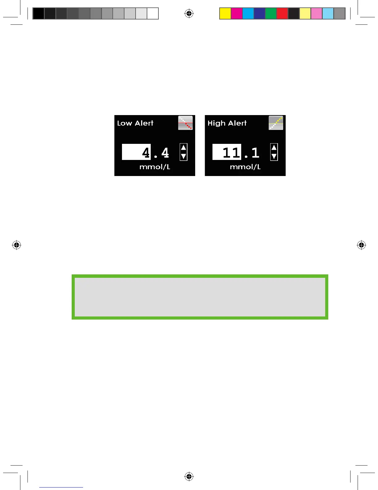 alerts are pre-set to 4.4 mmol/L and 11.1 mmol/L, but can be changed to