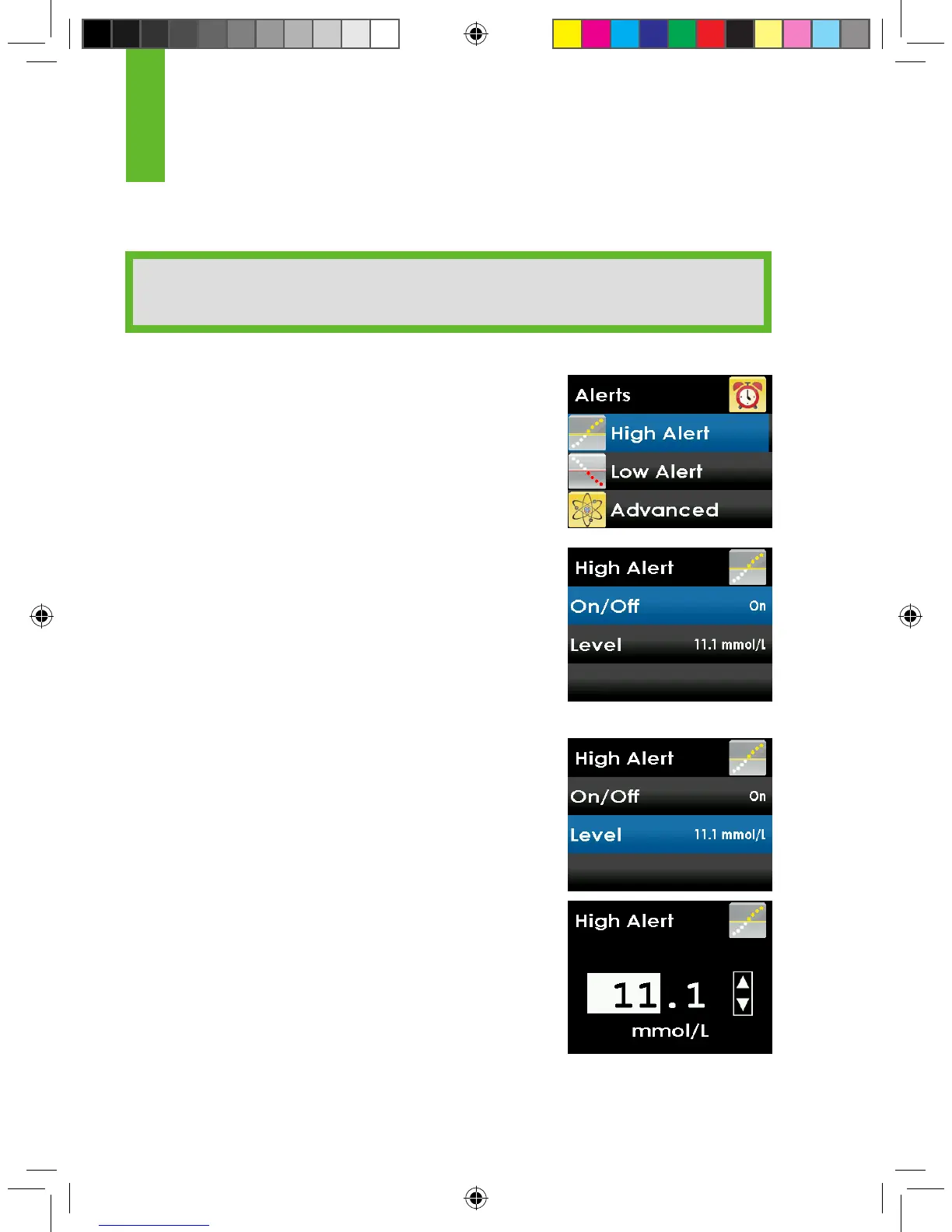 • The steps for setting both the high alert and the low alert are the same.