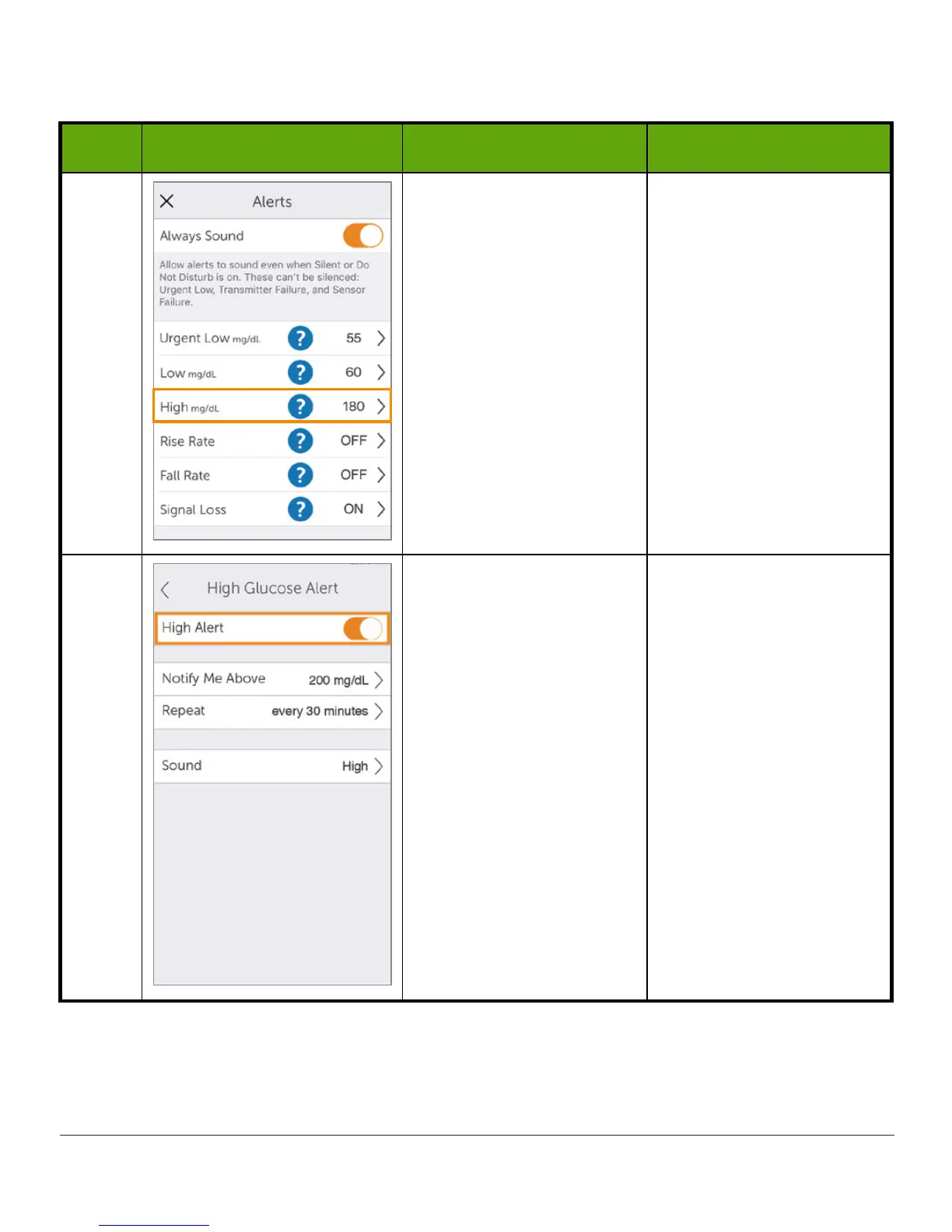 settings (mg/dL).