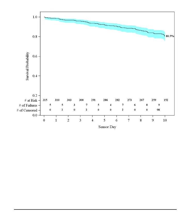 Figure 1-A. Kaplan Meier curve of sensor life (adults; N = 315)