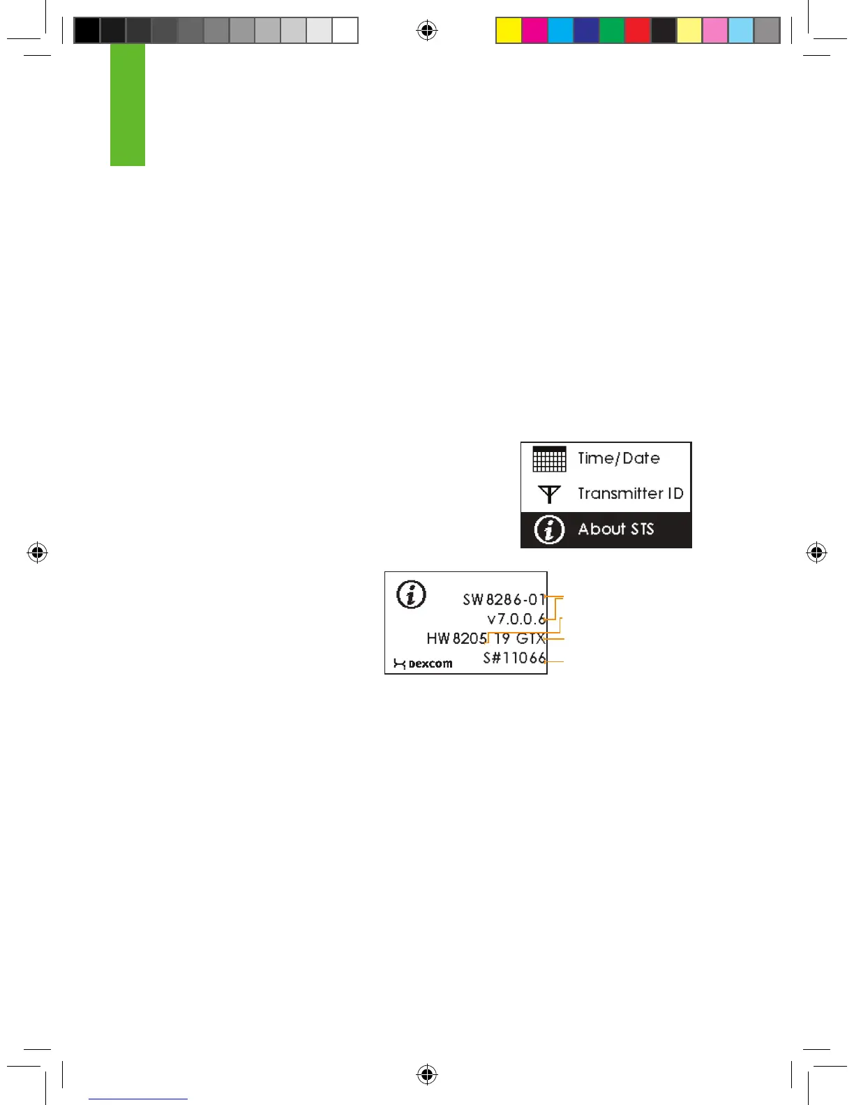 and version, hardware number and version, Transmitter type, and Receiver serial number. (“STS”