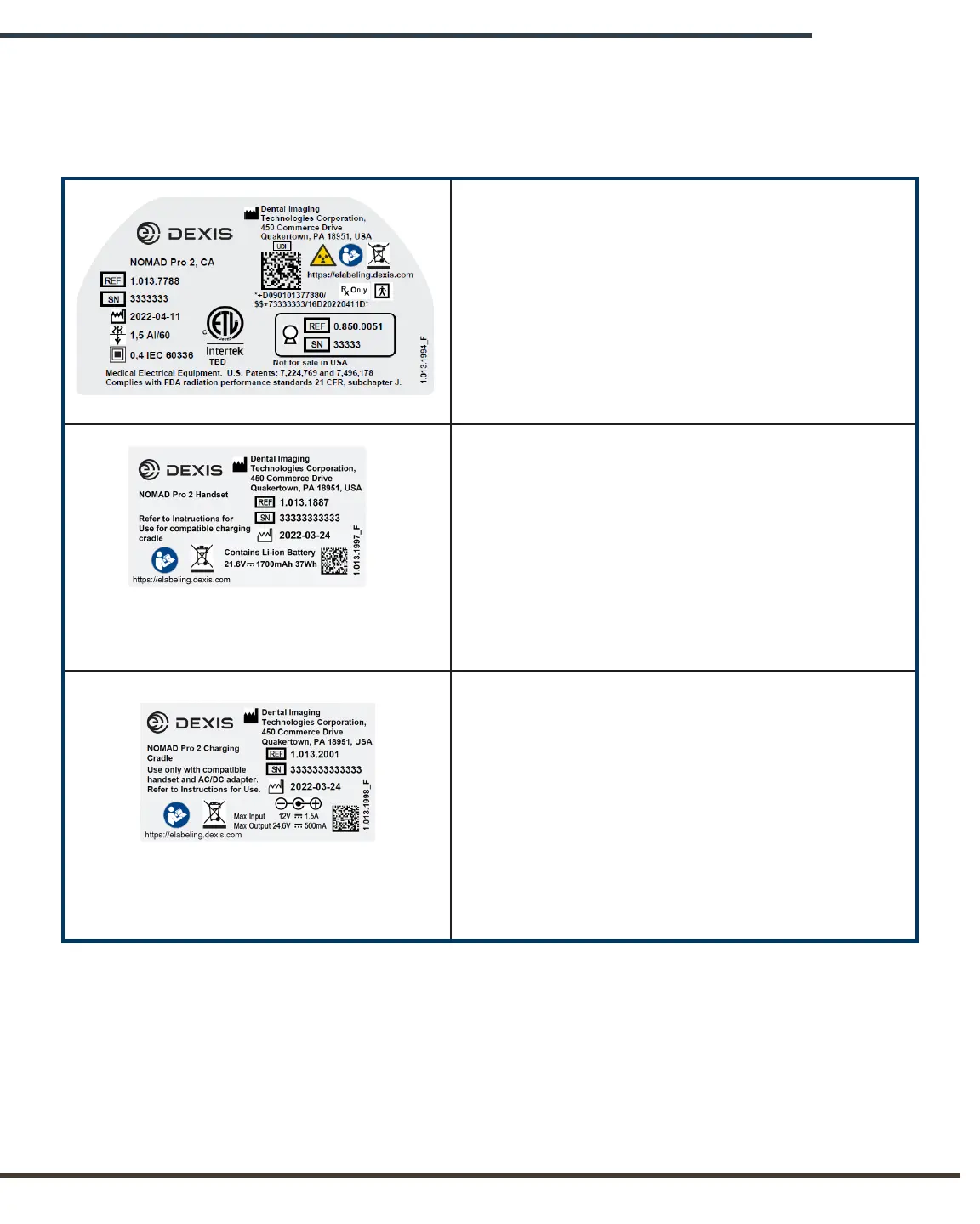 The Handheld X-ray System and Charger have identification labels that specify the model