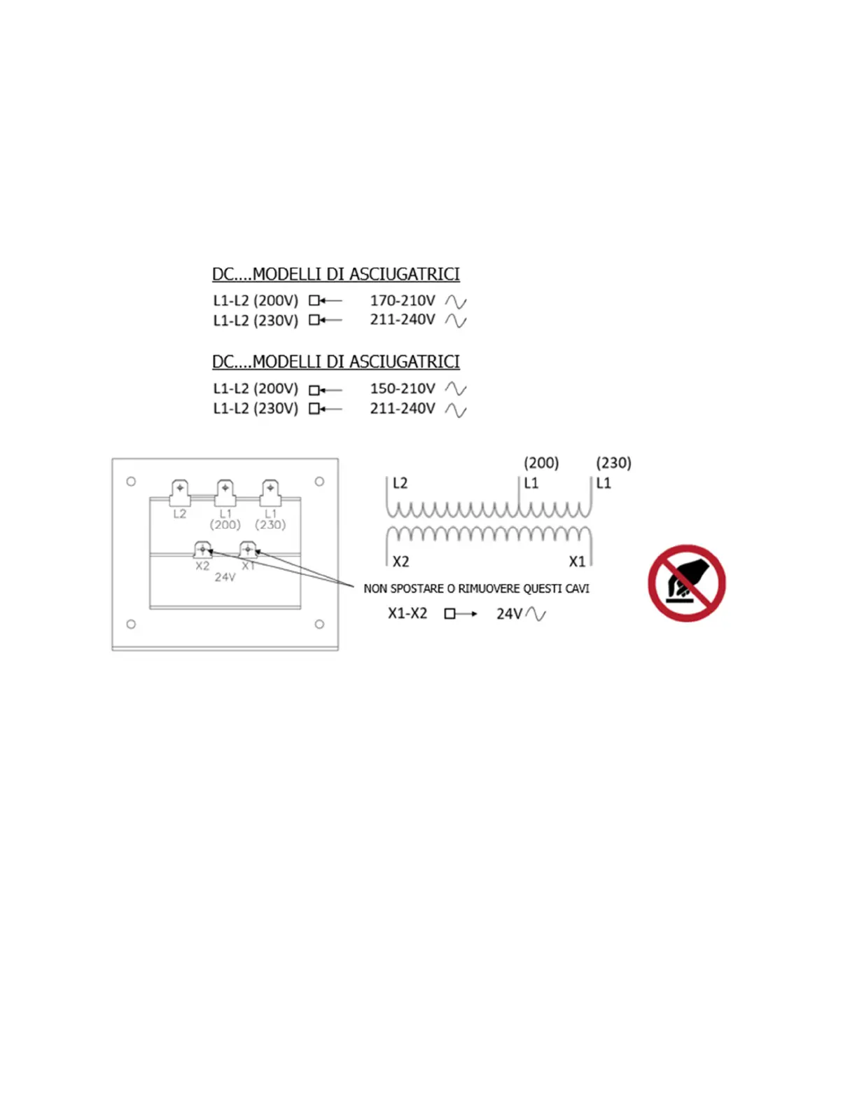 per le alimentazioni tra 150 e 210 volt. Utilizzare il morsetto contrassegnato con "L1 230 V"